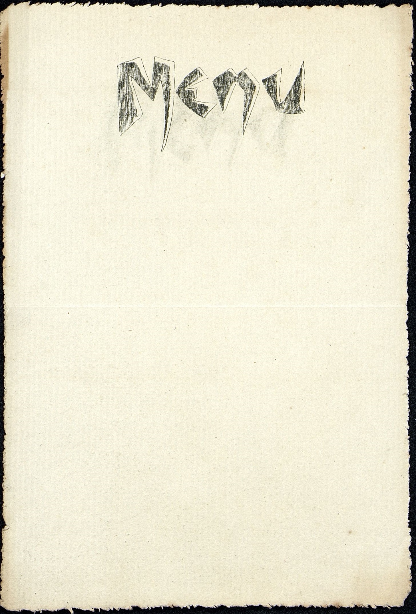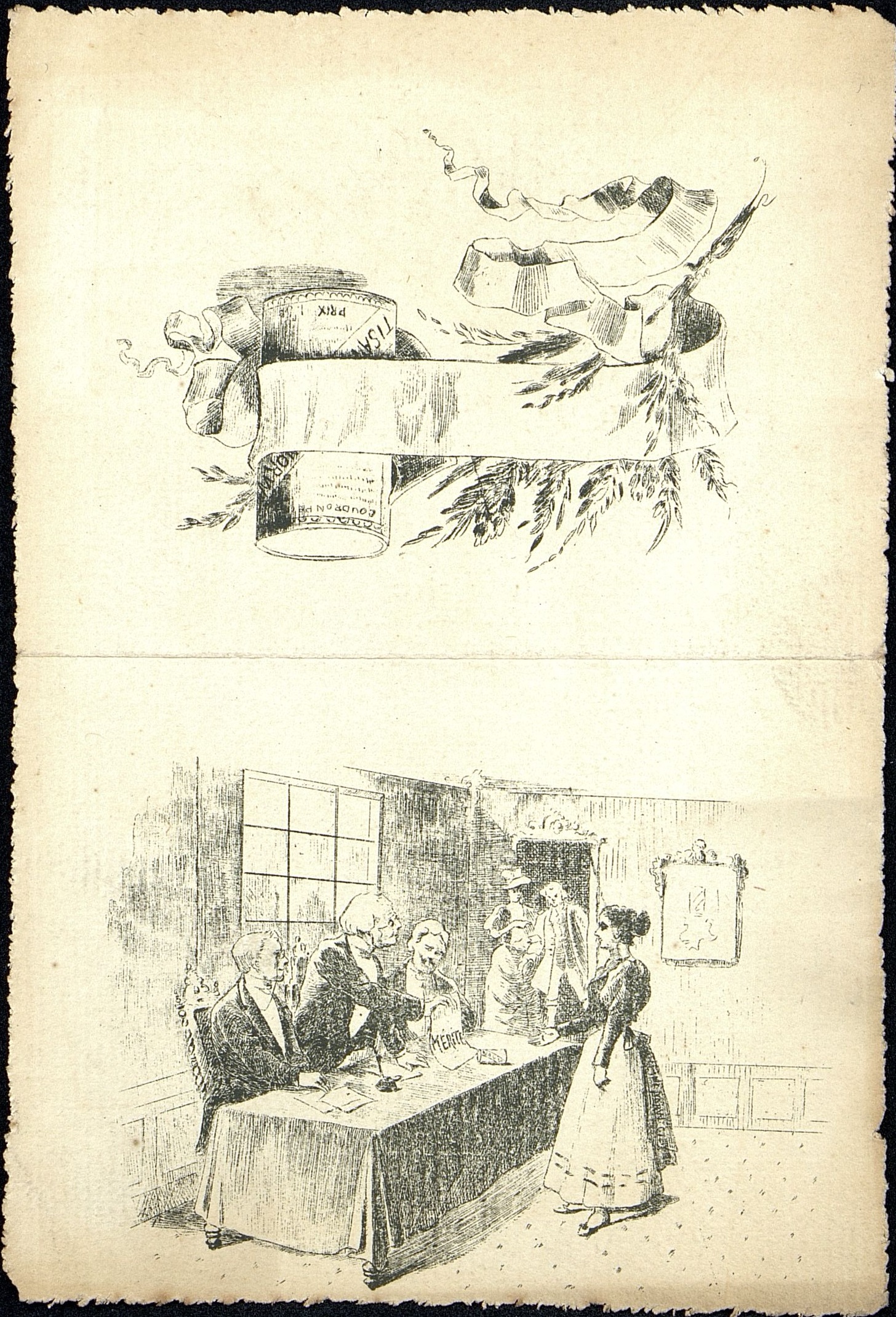 - Menu pliant vierge illustré. Sans indication de lieu et de date. Une table avec trois messieurs qui délivre une affiche "MERITE" à une jeune fille. Une boîte à tisane Coudron avec rubans et rameaux de plantes.