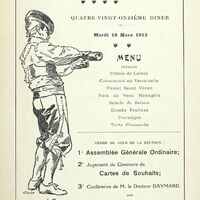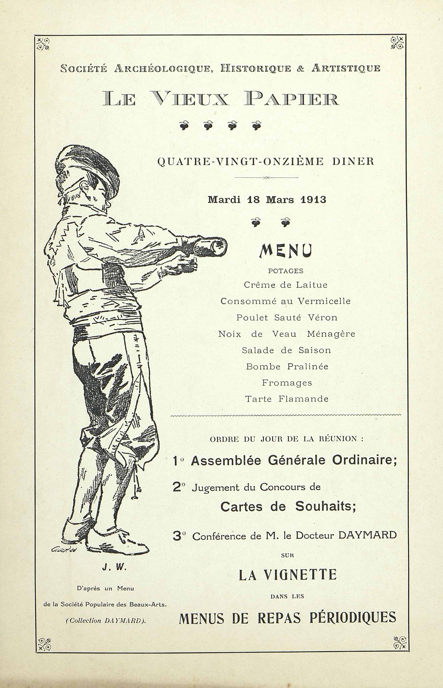 91e Dîner de la Société, Historique et Artistique Le Vieux Papier avec une conférence du docteur Daymard sur la Vignette dans les menus de repas périodiques. Une illustration signée J.W.