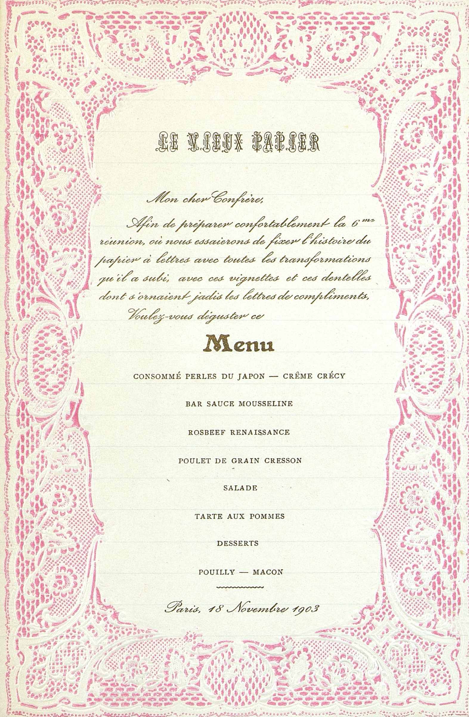 Menu pliant du 18 novembre 1903 de la Société Archéologique Historique et Artistique Le Vieux Papier. Menu imitation dentelle.
