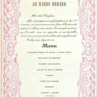 Plats servis : Consommé aux Perles du Japon. Crème Crécy. Bar sauce mousseline. Rosbeef Renaissance. Poulet de grain Cresson. Salade. Tarte aux Pommes. Desserts.