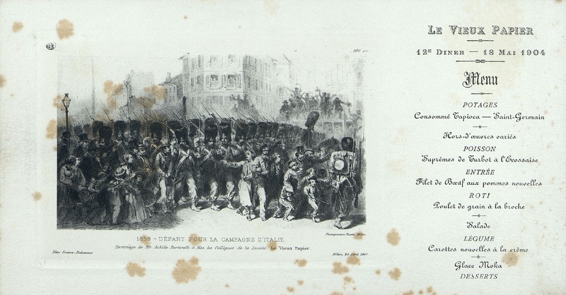 12e Dîner de la Société, Historique et Artistique Le Vieux Papier avec une image "1859, Départ pour la Campagne d'Italie".