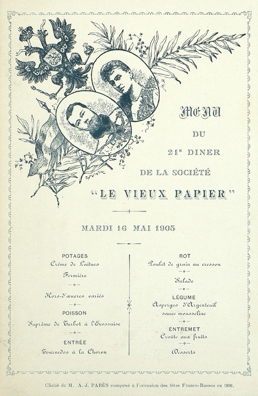 21e Dîner de la Société, Historique et Artistique Le Vieux Papier du 16 mai 1905. Thème abordé : les fêtes Franco-Russes en 1896 d'après un cliché de M. Parès.