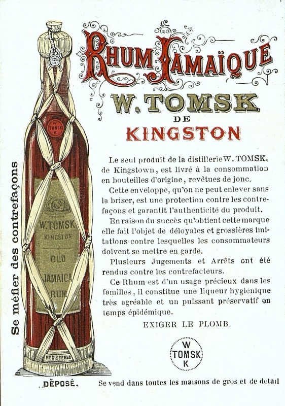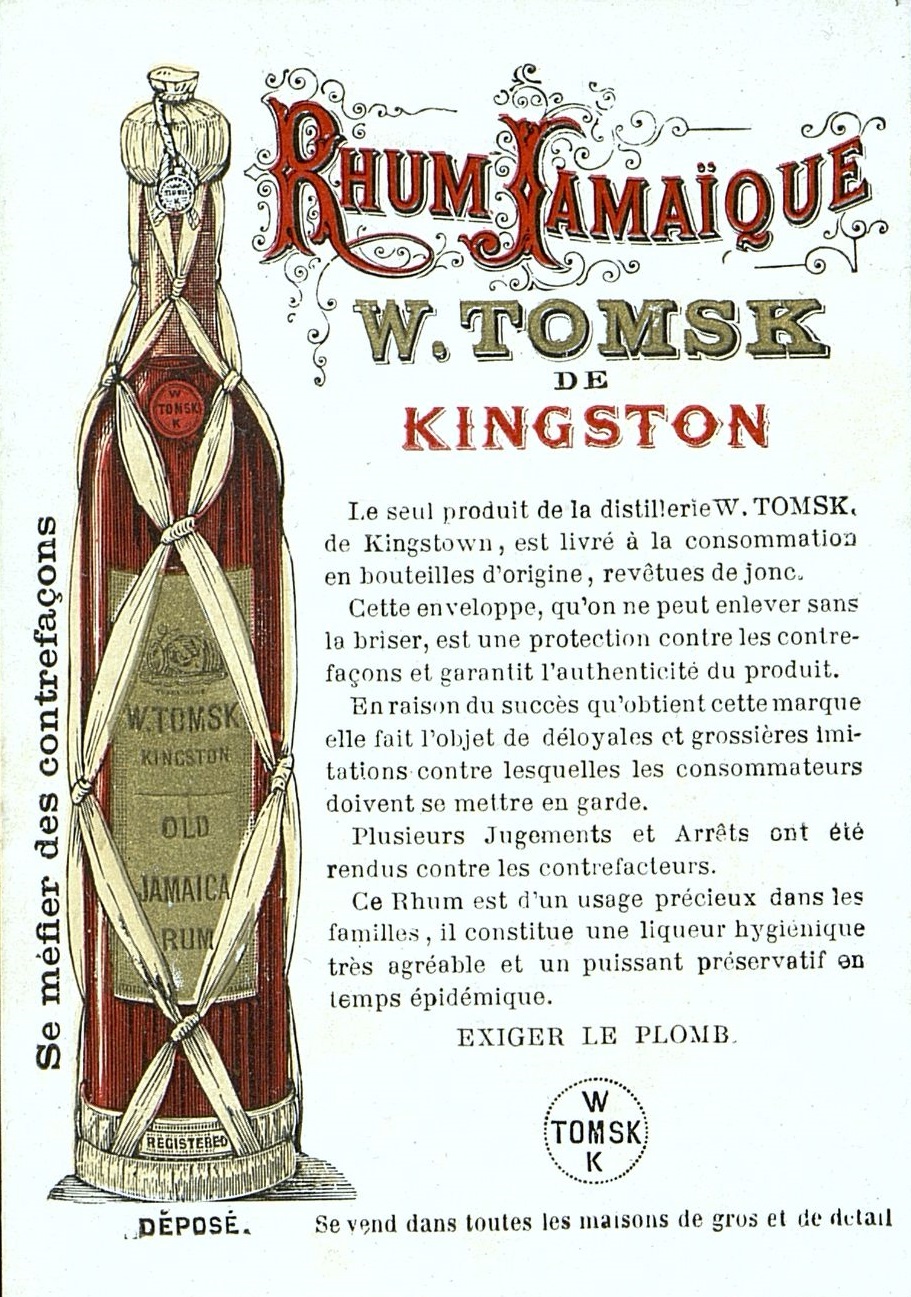 Carte publicitaire pour le Rhum Jamaïque, W. Tomsk de Kingston. Illustrée et en couleur.