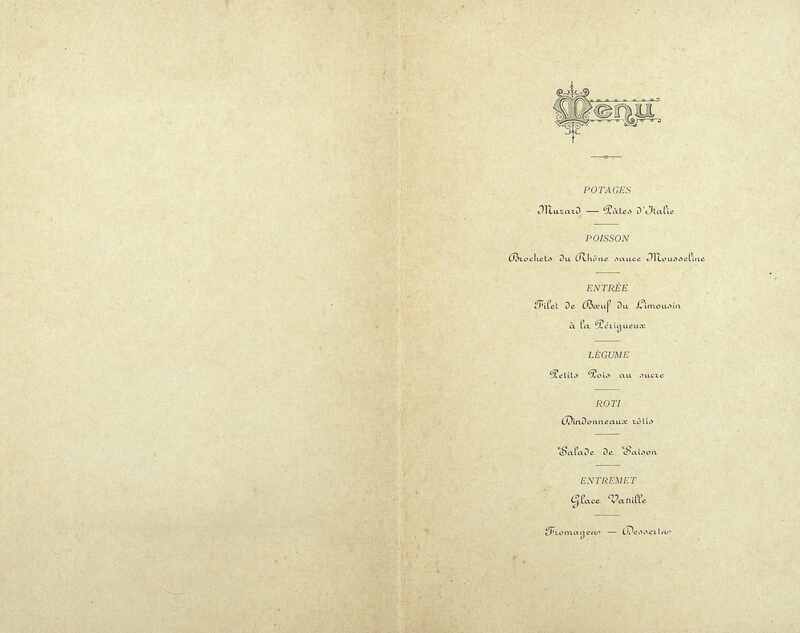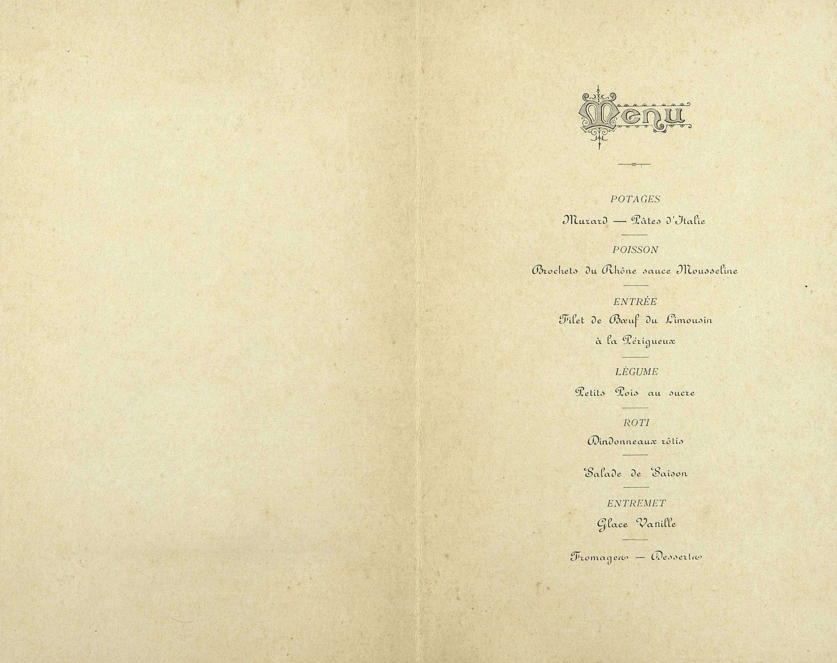 Plats servis : Potages : Muzard et Pâtes d'Italie. Poisson : Brochets du Rhône sauce Mousseline. Entrée : Filet de Bœuf du Limousin à la Périgueux. Légume : Petits pois au sucre. Rôti : Dindonneau rôtis. Salade de Saison. Entremet : Glace Vanille. Fromages. Desserts.
