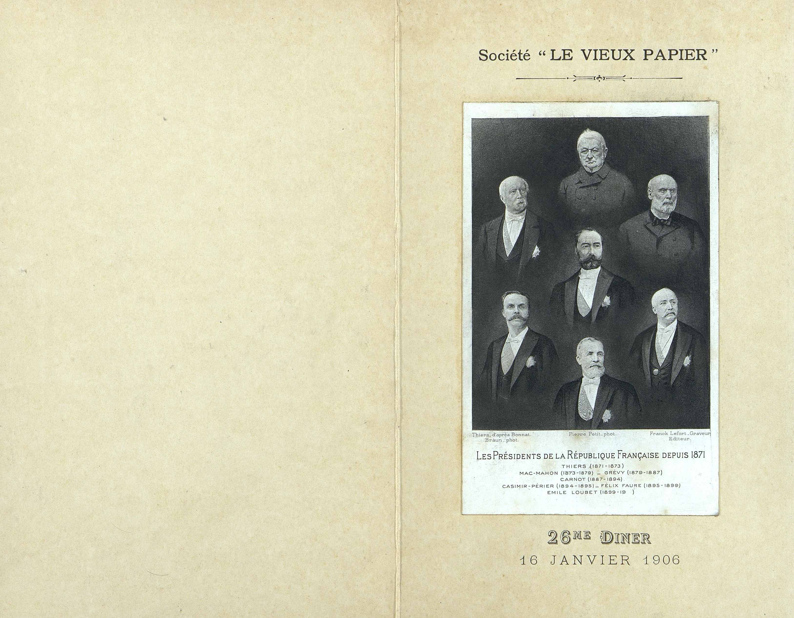 26e Dîner de la Société, Historique et Artistique Le Vieux Papier du 16 janvier 1906. Menu pliant et illustré d'une gravure des présidents de la République Française depuis 1871.