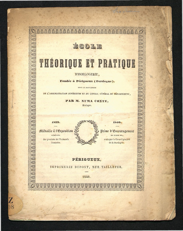 Ecole théorique et pratique d'horlogerie : fondée à Périgueux (Dordogne), sous le patronage de l'administration supérieure et du Conseil générale du département.