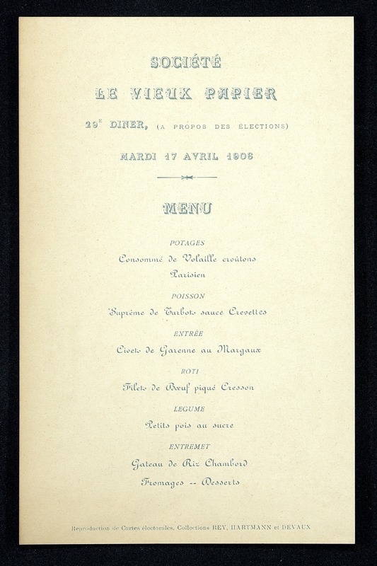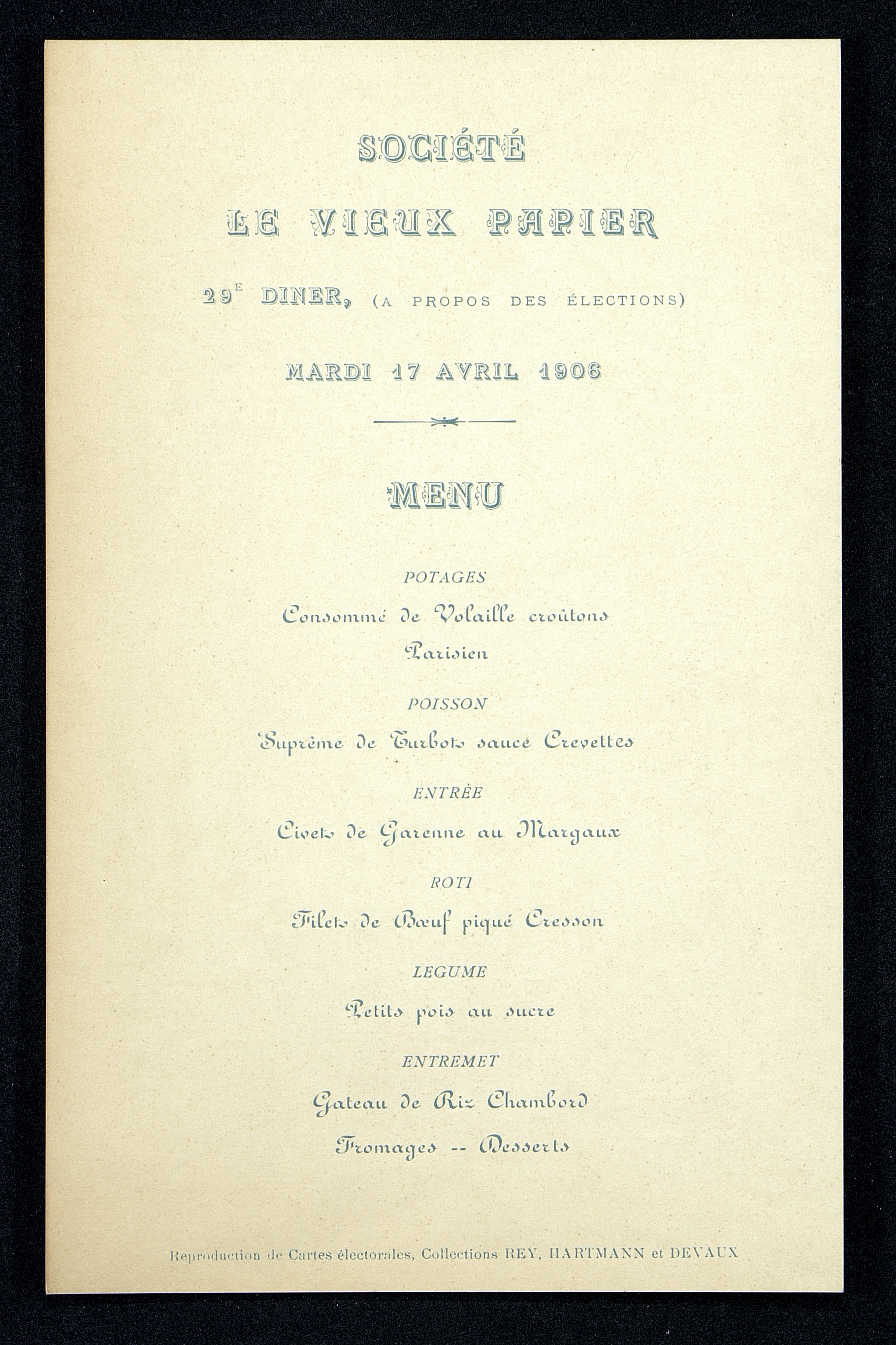 29e Dîner de la Société, Historique et Artistique Le Vieux Papier du 17 avril 1906, illustré du thème des élections et des cartes électorales.