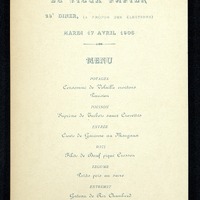 Plats servis : Potages : Consommé de Volaille croûtons. Parisien. Poisson : Suprême de Turbots sauce Crevettes. Entrée : Civet de Garenne au Margaux. Rôti : Filet de Bœuf piqué Cresson. Légume : Petits pois au sucre. Entremet : Gâteau de Riz Chambord. Fromages. Desserts.