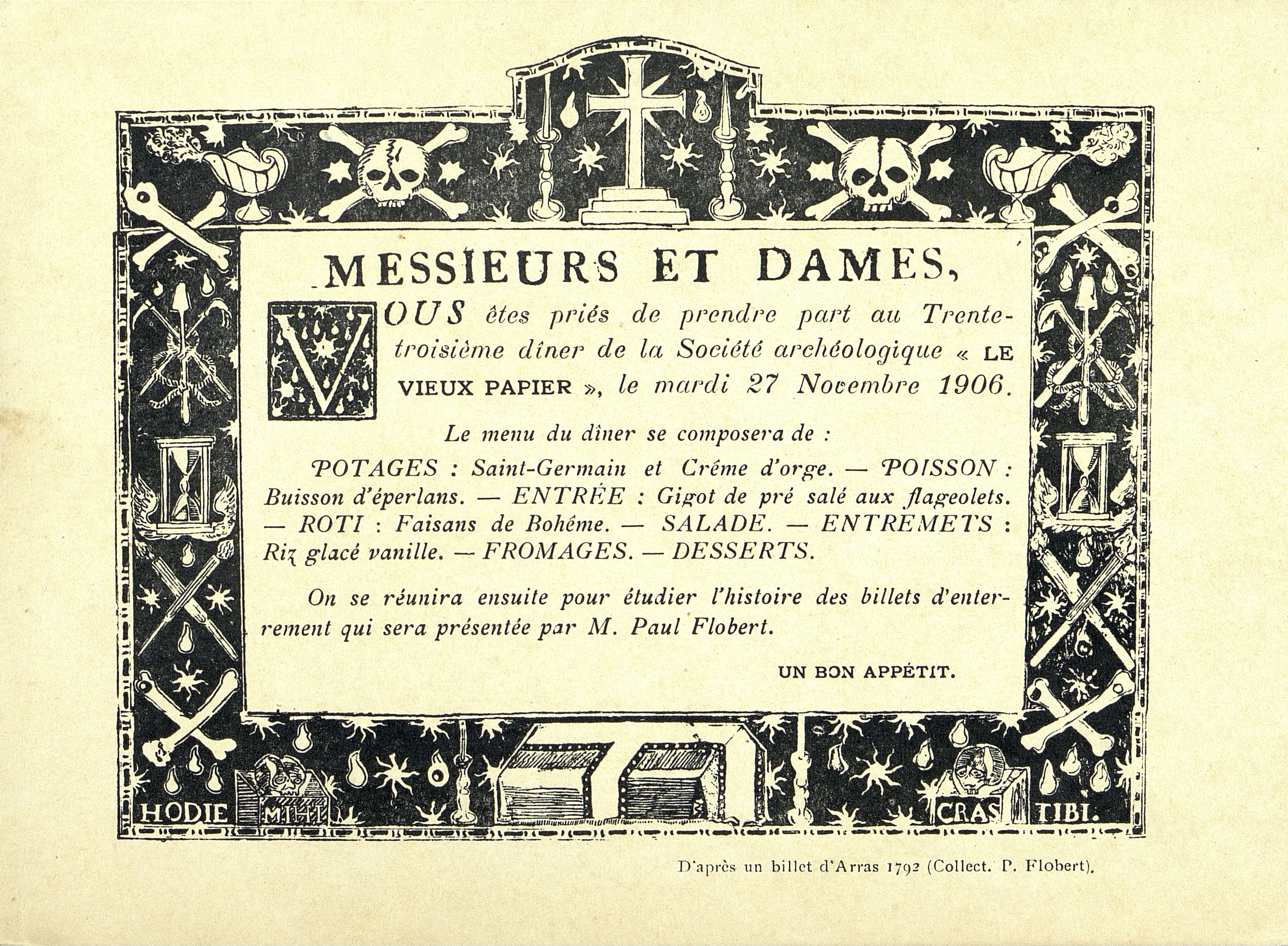 33e Dîner de la Société, Historique et Artistique Le Vieux Papier. Illustration d'après un billet d'Arras.