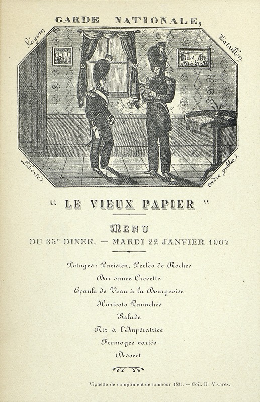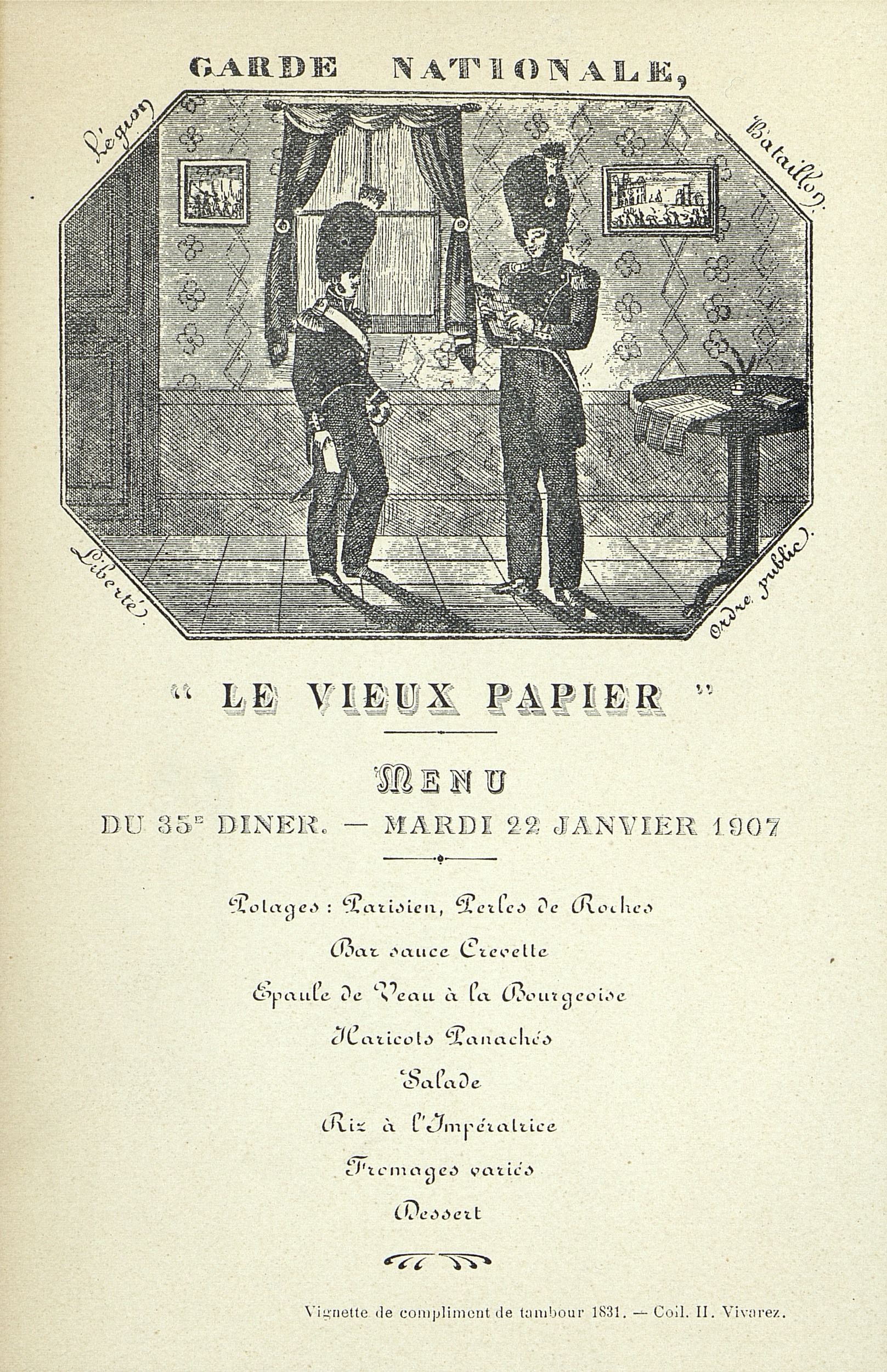 35e Dîner de la Société, Historique et Artistique Le Vieux Papier. Illustré, thème de la Garde Nationale. Vignette de compliment de tambour 1831.