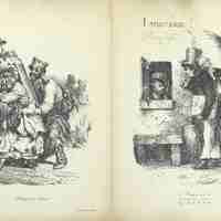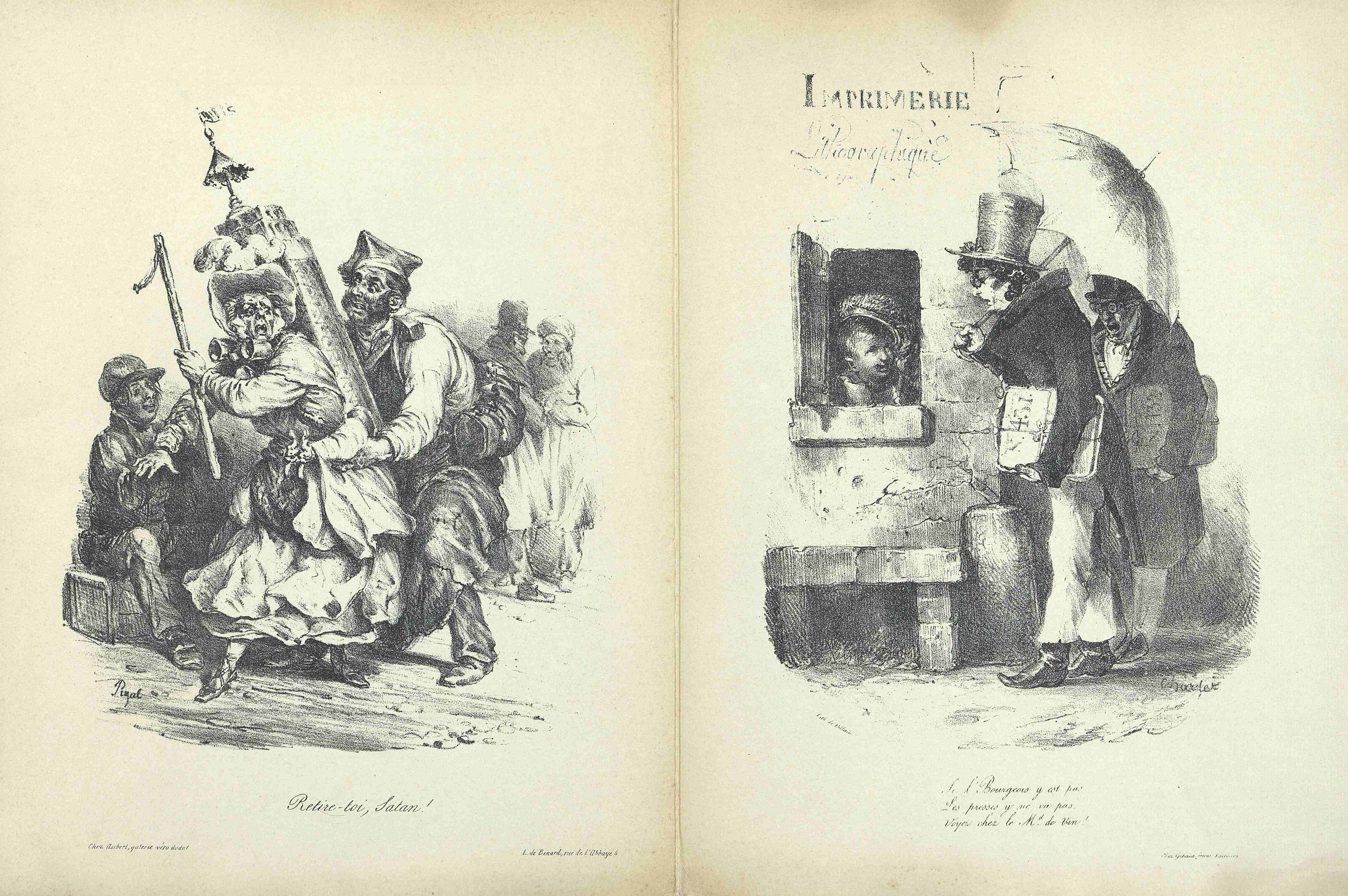 Illustrations : "Si le bourgeois y est pas, Les presses y ne va pas, Voyez chez le M[archan]d de vin " l'imprimerie lithographique par Charlet . L'Infidélité d'après Fragonard par le graveur Zwinger et le lithographe Bove dirigé par Noël ai et i.. Au verso : "Retire-toi Satan !" Chez Aubert, Galerie véro dodat, L. de Benard , 4 rue de l'Abbaye.
