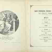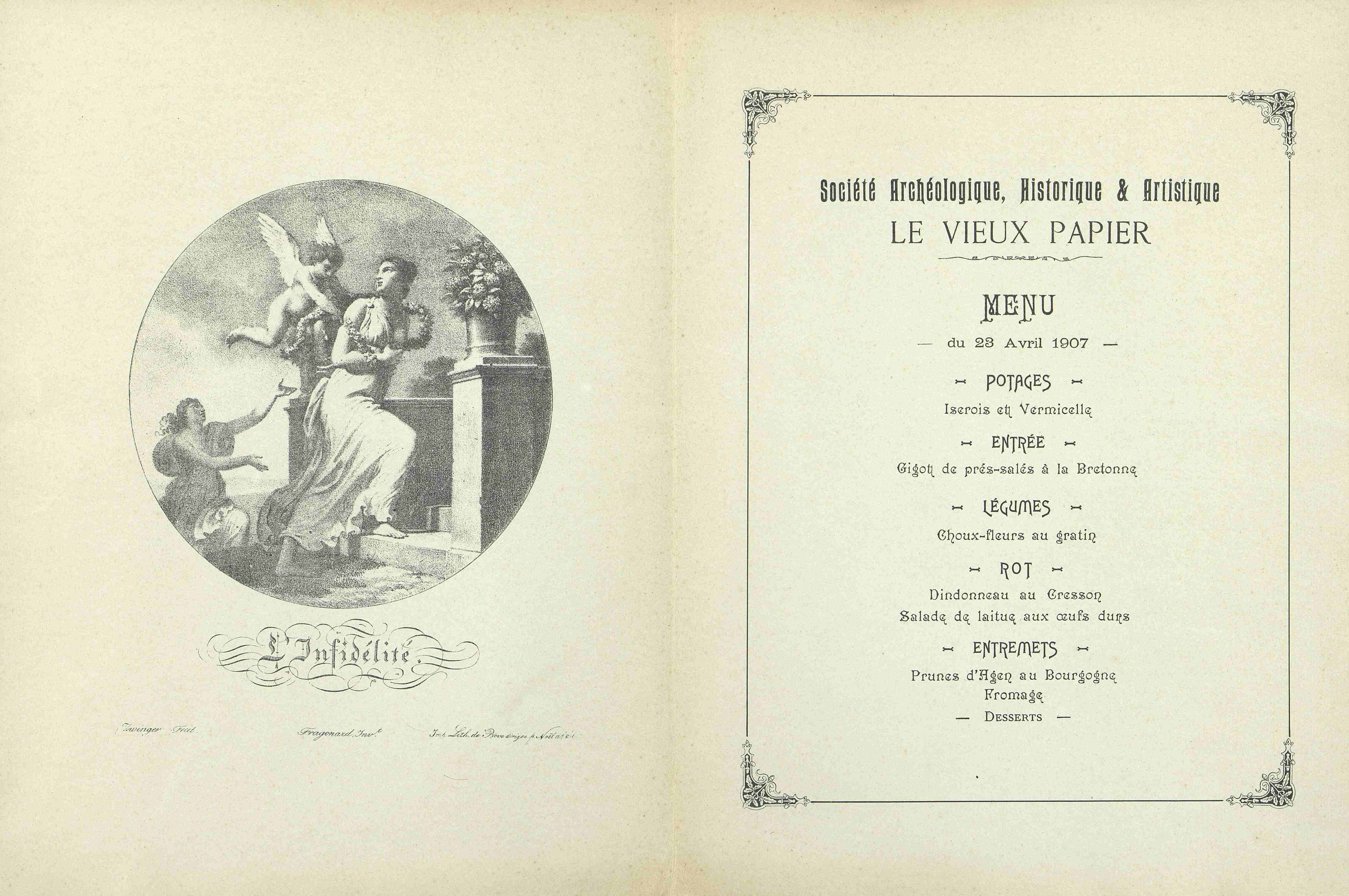 Dépliant illustré de la Société Archéologique Historique et Artistique Le Vieux Papier pour son repas du 23 avril 1907. Le thème est : l, imprimerie lithograohique.