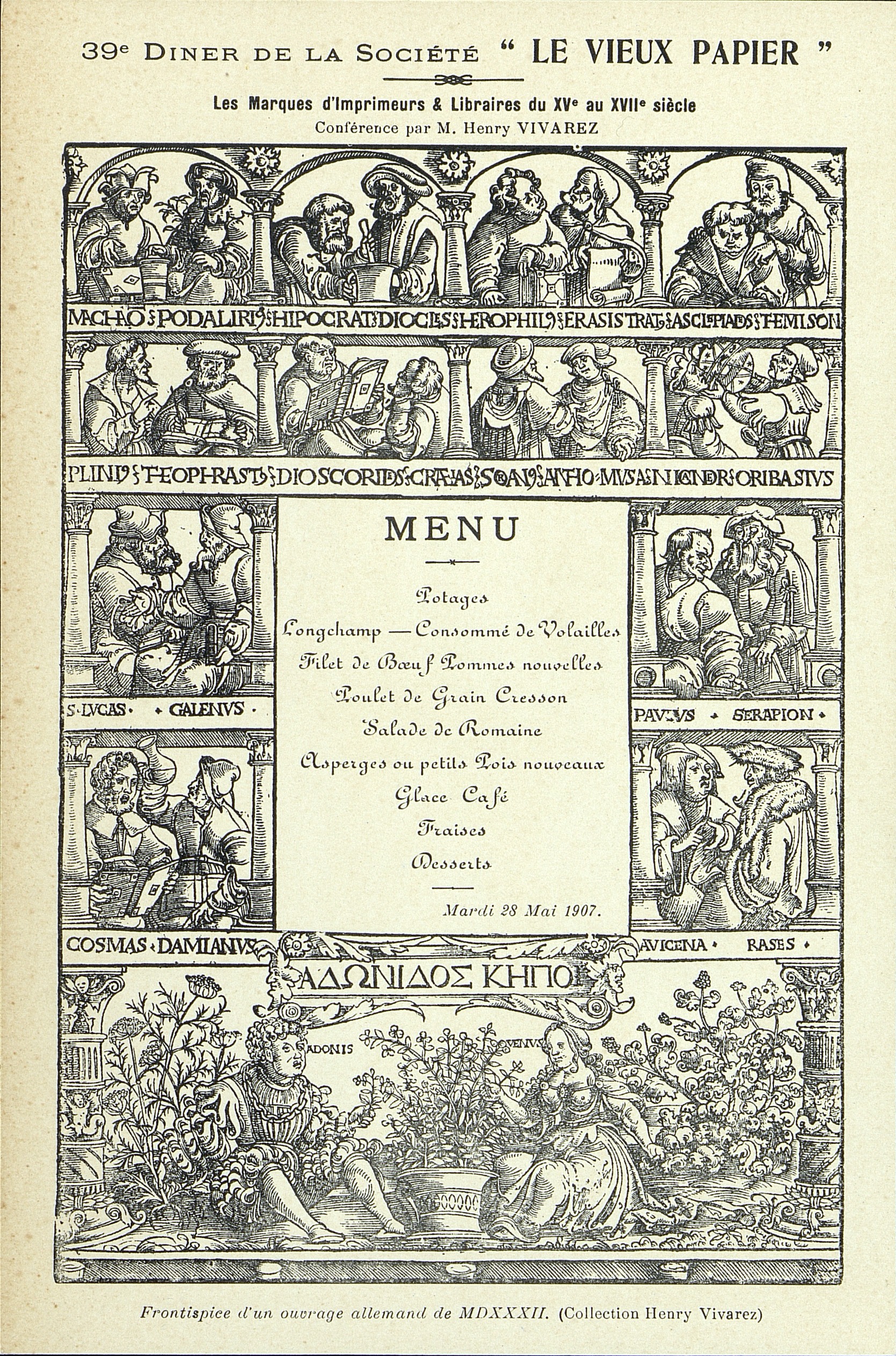 39e Dîner de la Société, Historique et Artistique Le Vieux Papier. Le thème retenu est : Les marques de libraires du XVe au XVIIe siècle, conférence par M. Henry Vivarez.
