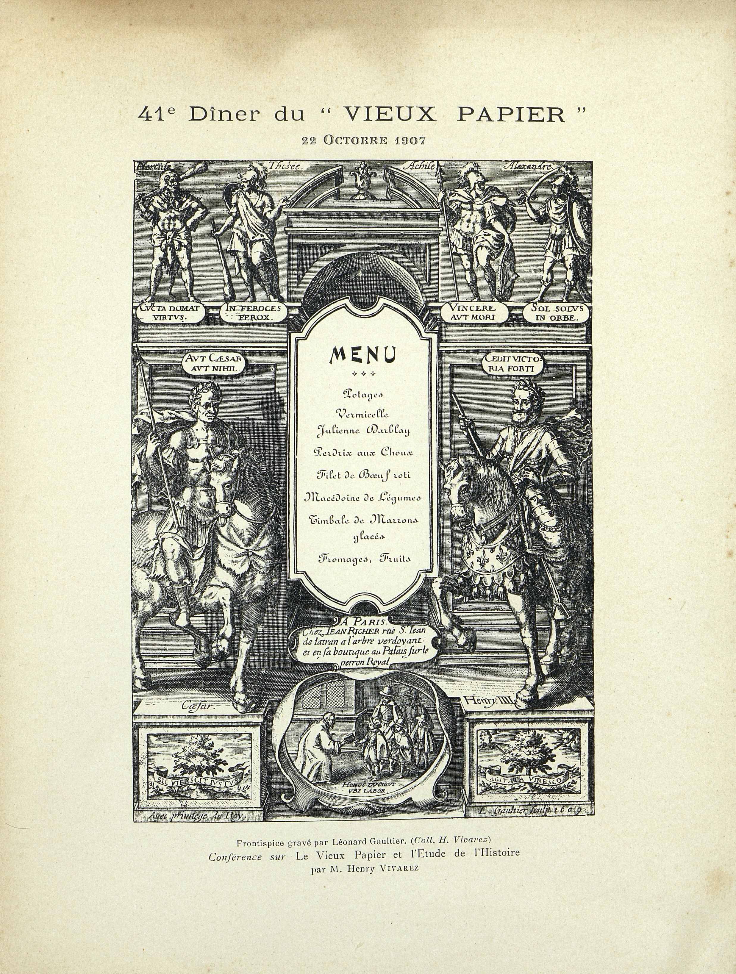 41e Dîner de la Société, Historique et Artistique Le Vieux Papier du 22 octobre 1907, avec une causerie sur le Vieux papier et l'Etude de l'Histoire par M. Henry Vivarez. Illustration d'un frontispice gravé par Léonard Gaultier.