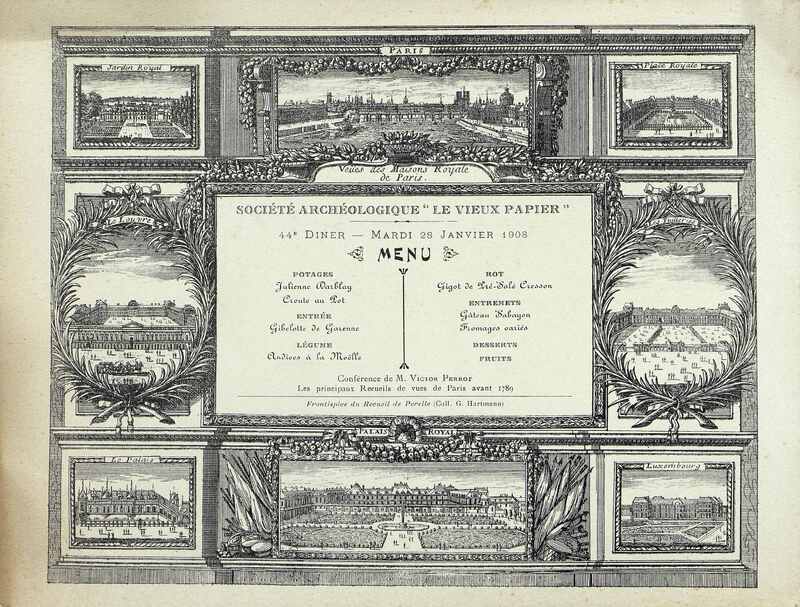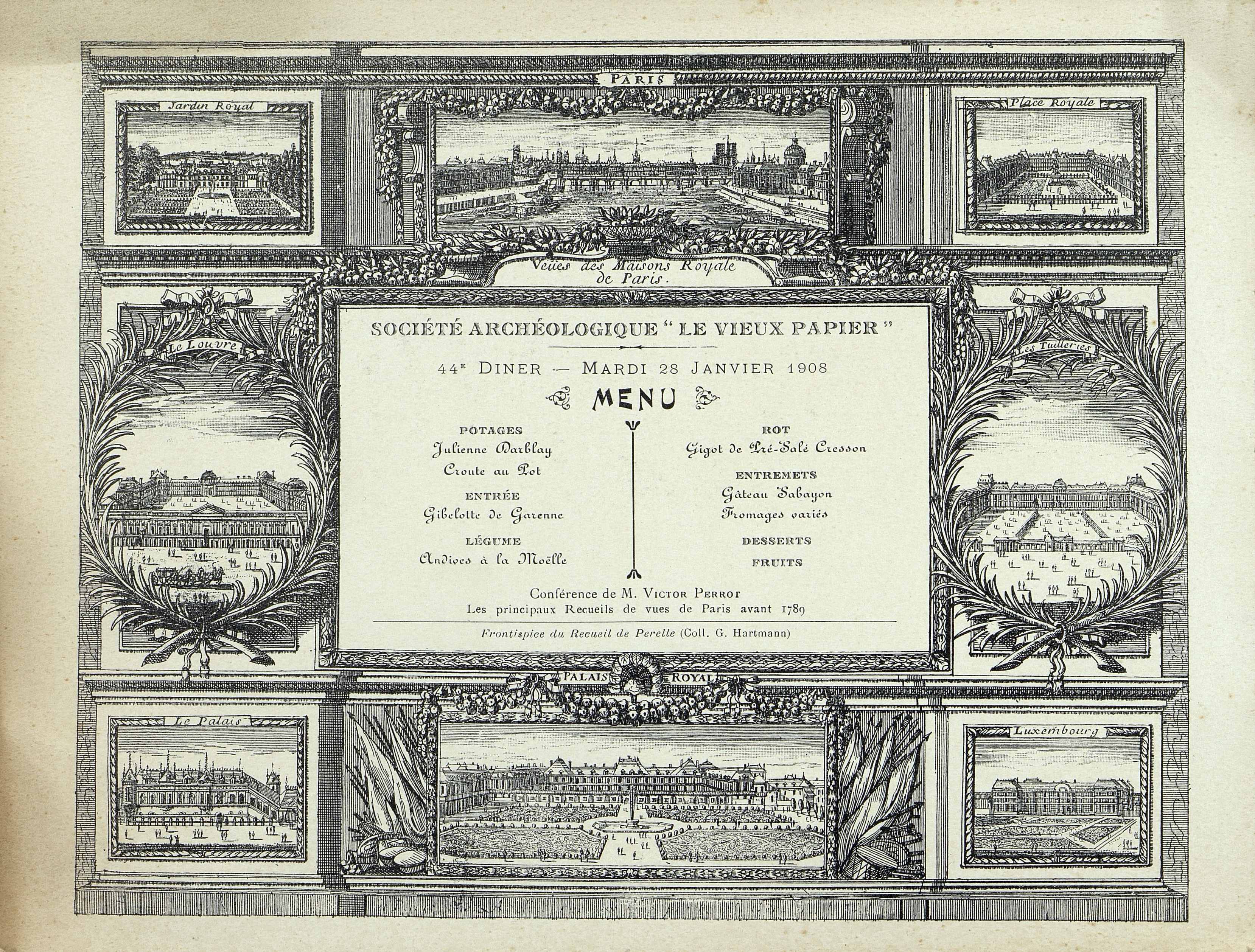 44e Dîner de la Société, Historique et Artistique Le Vieux Papier en date du 28 janvier 1908, suivi d'une conférence de M. Victor Perrot sur : Les principaux recueils de vues de Paris avant 1789. Illustration d'après le Frontispice du Recueil de Perelle de la collection G. Hartmann.
