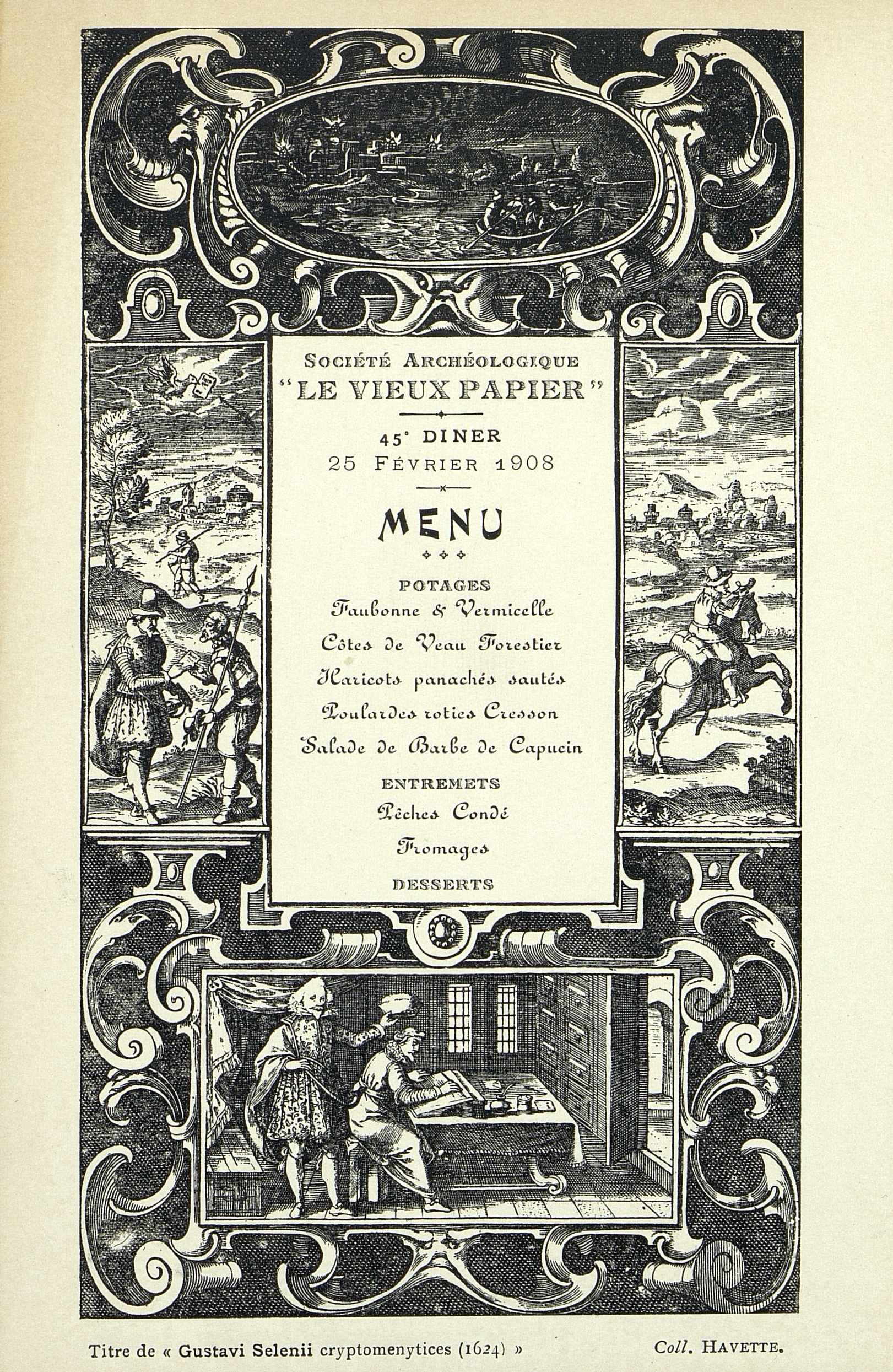 45e Dîner de la Société, Historique et Artistique Le Vieux Papier, le 25 février 1908. Illustration : Titre de "Gustavi Selenii cryptomenytices (1624)". Collection Havette.