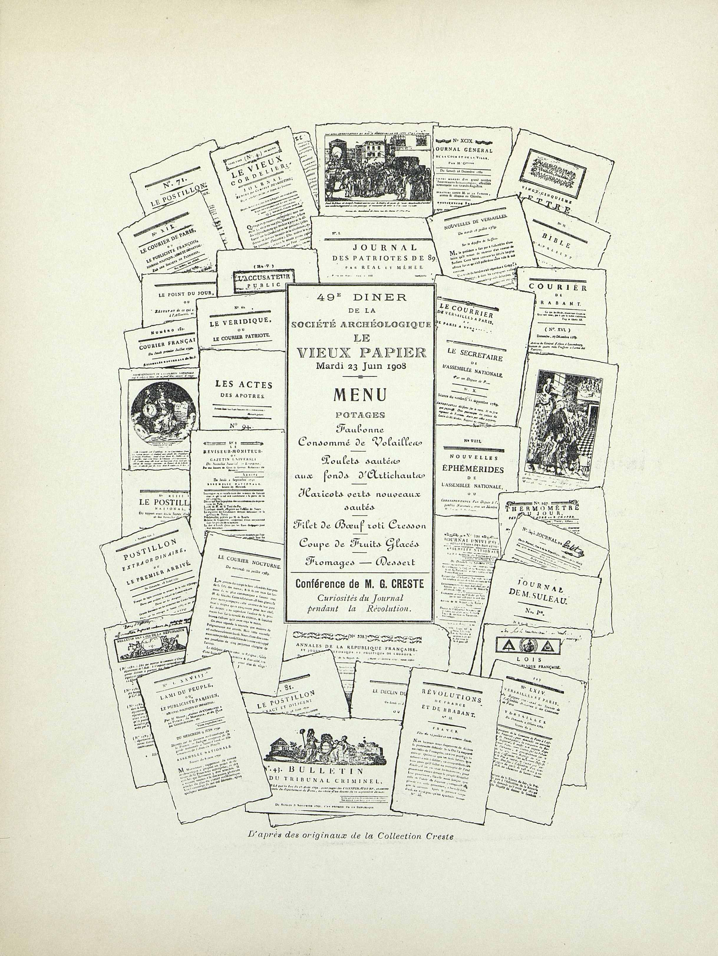 49e Dîner de la Société, Historique et Artistique Le Vieux Papier du 23 juin 1908 avec une conférence de M. G. Creste sur les Curiosités du Journal pendant la Révolution.
