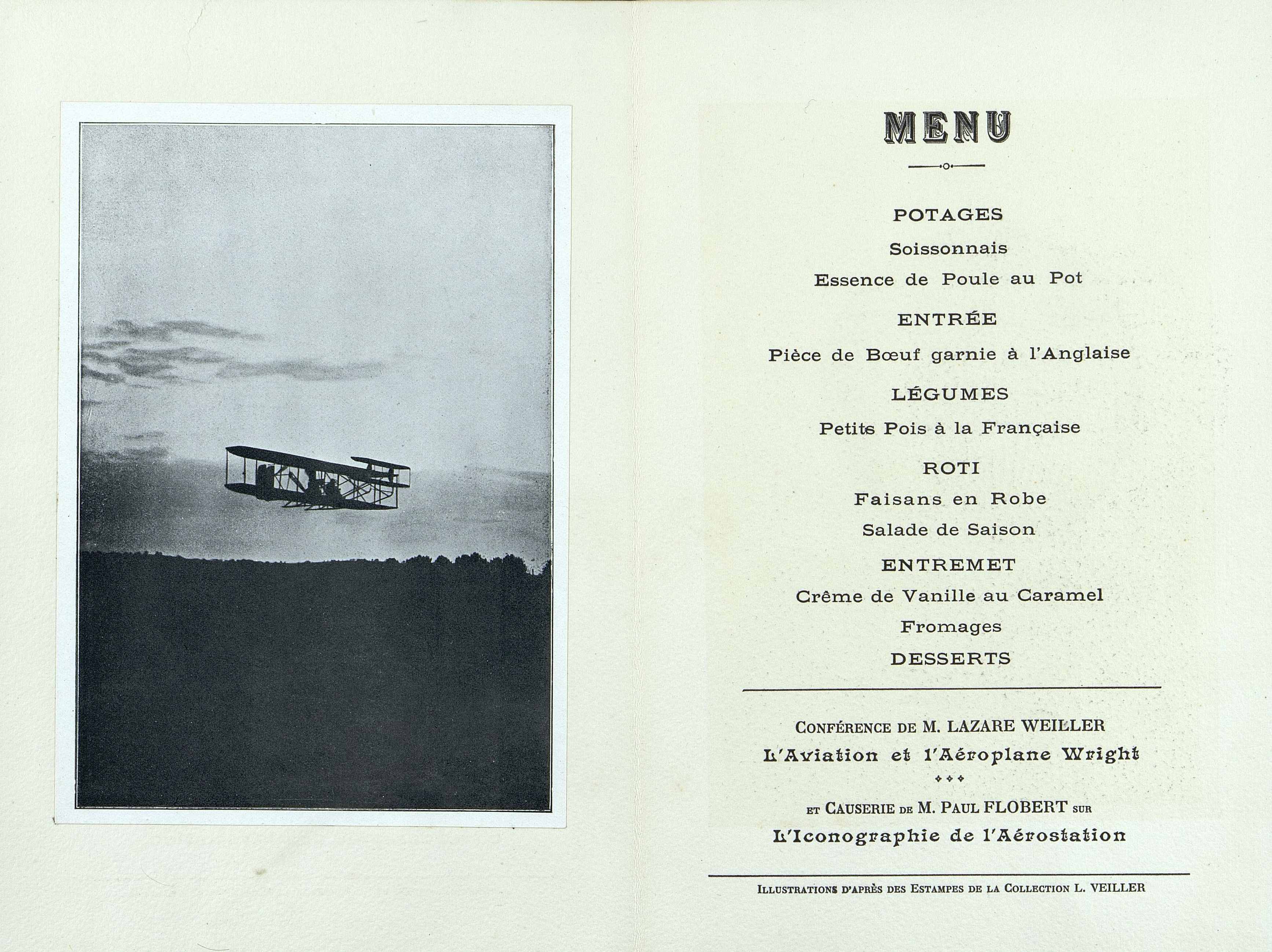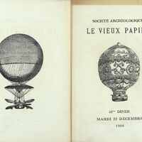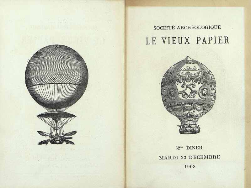 52e Dîner de la Société, Historique et Artistique Le Vieux Papier du mardi 22 décembre 1908. Document illustré de dessins et photographies. Conférence de M. Lazare Weiller sur l'Aviation et l'Aéroplane Wright. Causerie de M. Paul Flobert sur l'Iconographie de l'Aérostation.