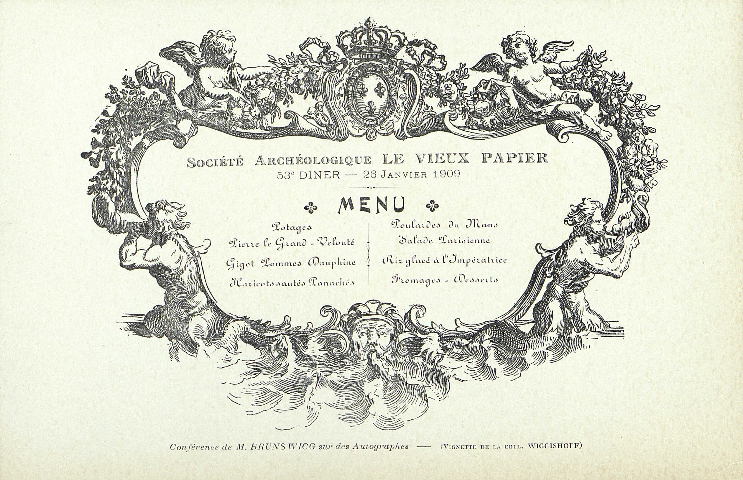 53e Dîner de la Société, Historique et Artistique Le Vieux Papier en date du 26 janvier 1909 avec une conférence de M. Brunswicg sur les Autographes.