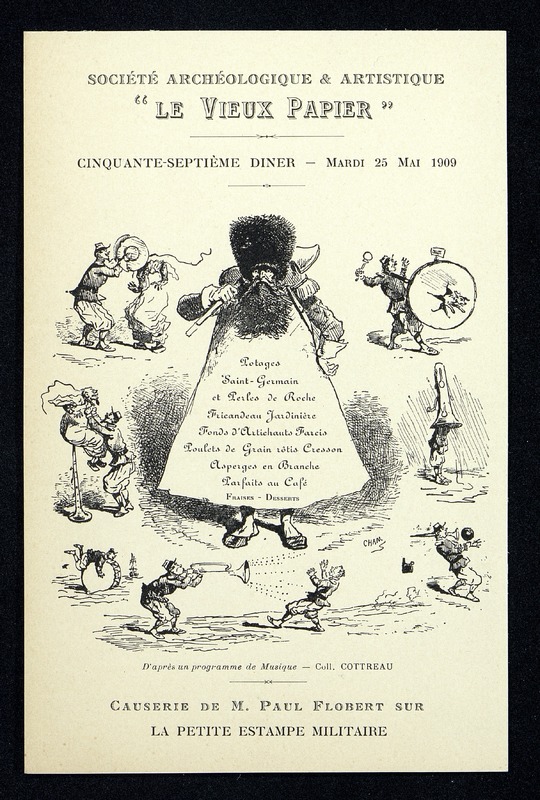 57e Dîner de la Société, Historique et Artistique Le Vieux Papier du 25 mai 1909, suivi d'une causerie de M. Paul Flobert sur La Petite Estampe Militaire. Illustration de la collection Cottreau.