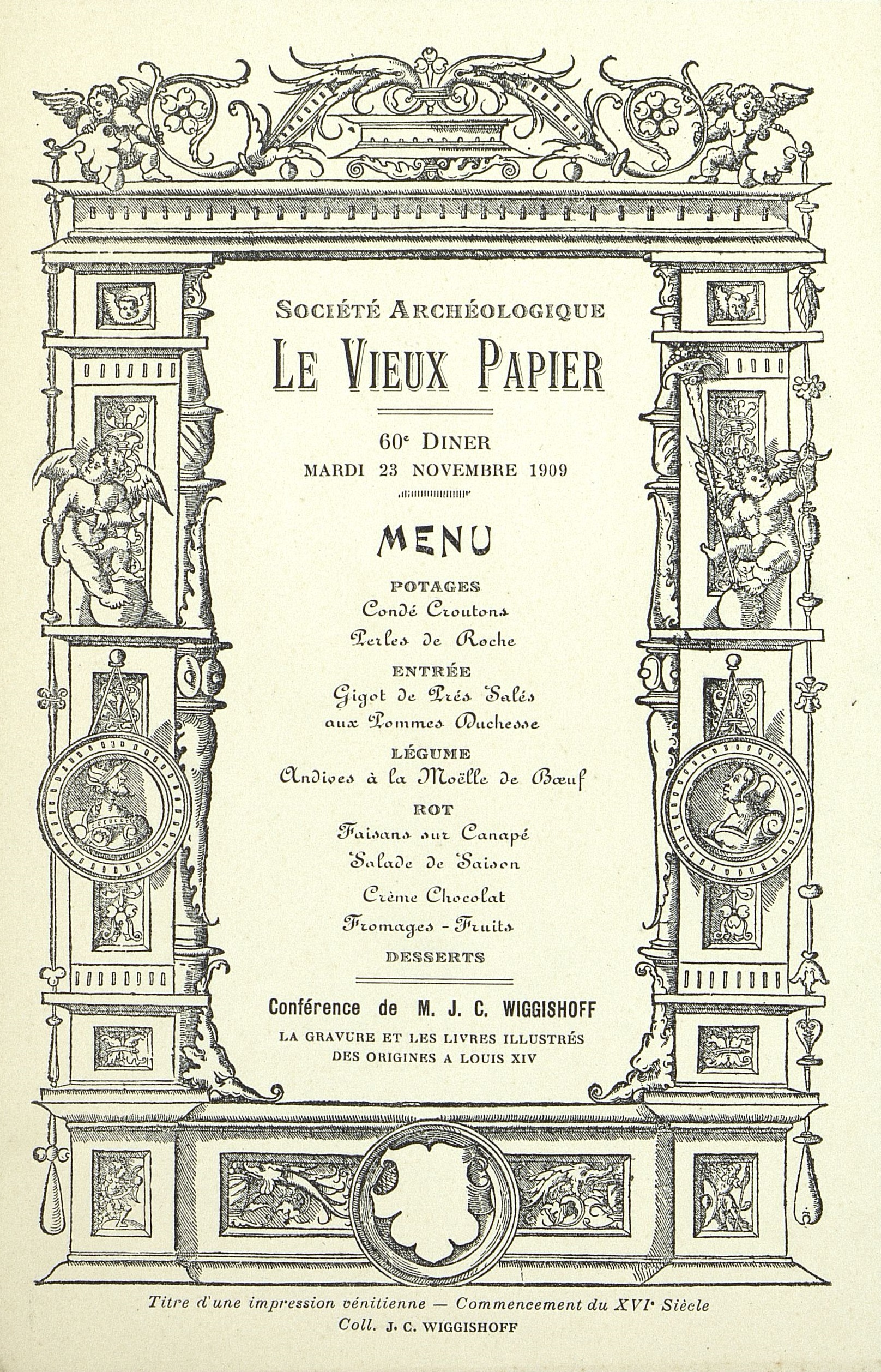 60e Dîner de la Société, Historique et Artistique Le Vieux Papier avec pour thème : La Gravure et les livres illustrés des origines à Louis XIV. Impression vénitienne.