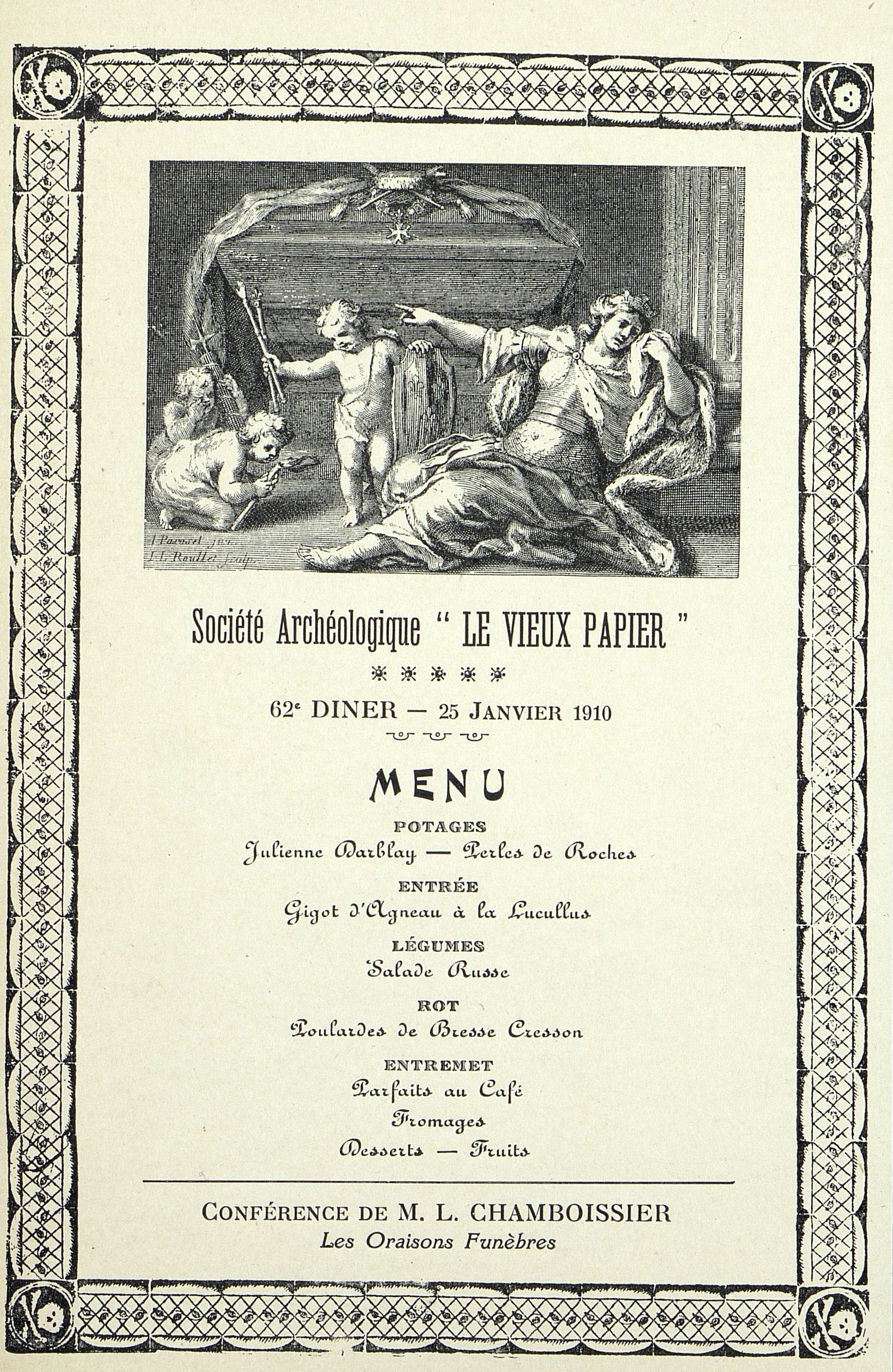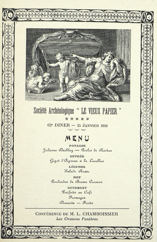 62e Dîner de la Société, Historique et Artistique Le Vieux Papier avec une conférence de M. L. Chamboissier. " Les Oraisons funèbres" de l'abbé Fravreau pour Louis Dauphin de France 1766 par Charles François Panard (1689-1765) et Jean-Louis Roullet (1645-1699) graveurs.