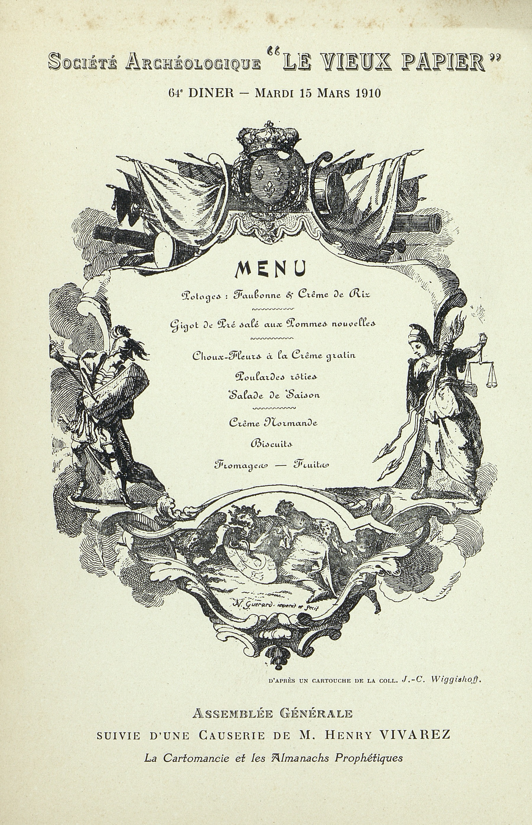 64e Dîner de la Société, Historique et Artistique Le Vieux Papier du 15 mars 1910, suivi d'une causerie de M. Henry Vivarez sur la Cartomancie et les Almanachs Prophétiques.