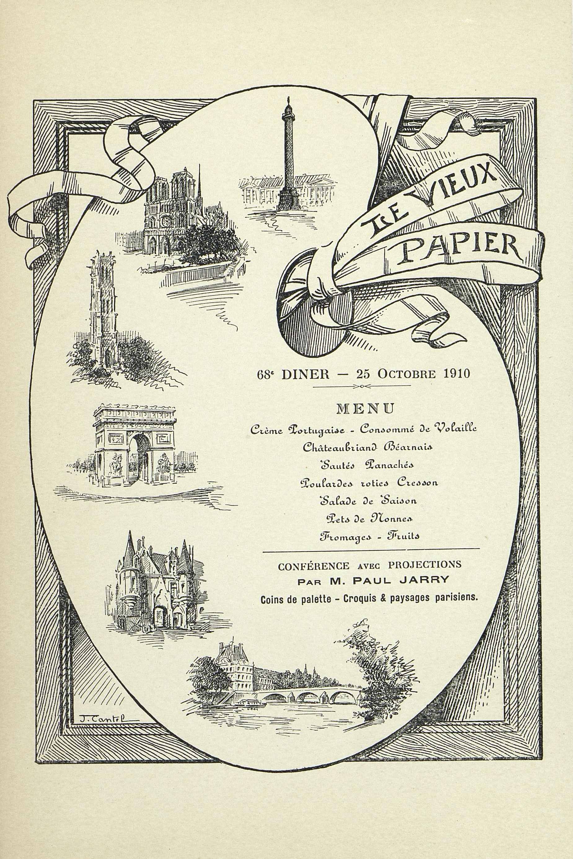 68e Dîner de la Société Archéologique Historique et Artistique Le Vieux Papier du 25 octobre 1910, suivi d'une conférence de M. Paul Jarry : Coins de palette, croquis et paysages parisiens. Illustré de monuments parisiens.