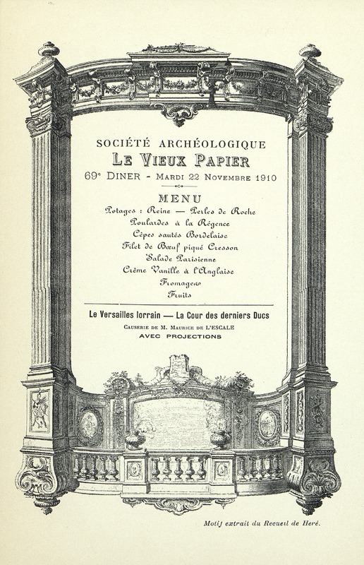 69e Dîner de la Société Archéologique Historique et Artistique Le Vieux Papier du 22 novembre 1910, et une causerie de M. Maurice de l'Escale sur Le Versailles lorrain, la cour des derniers ducs : avec projections.