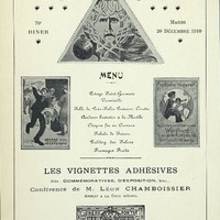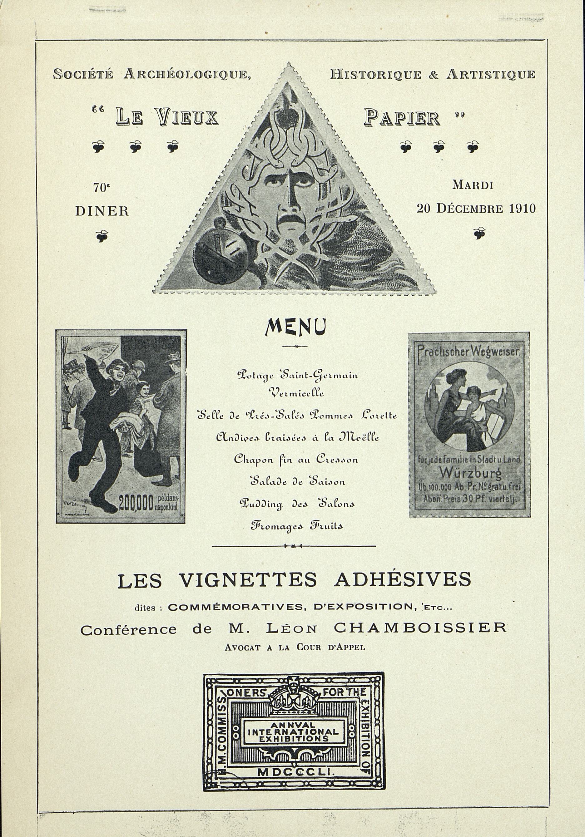 70e Dîner de la Société Archéologique Historique et Artistique Le Vieux Papier, du 20 décembre 1910, suivi d'une conférence de M. Léon Chamboissier sur Les vignettes dites commémoratives, d'exposition, adhésives, etc...