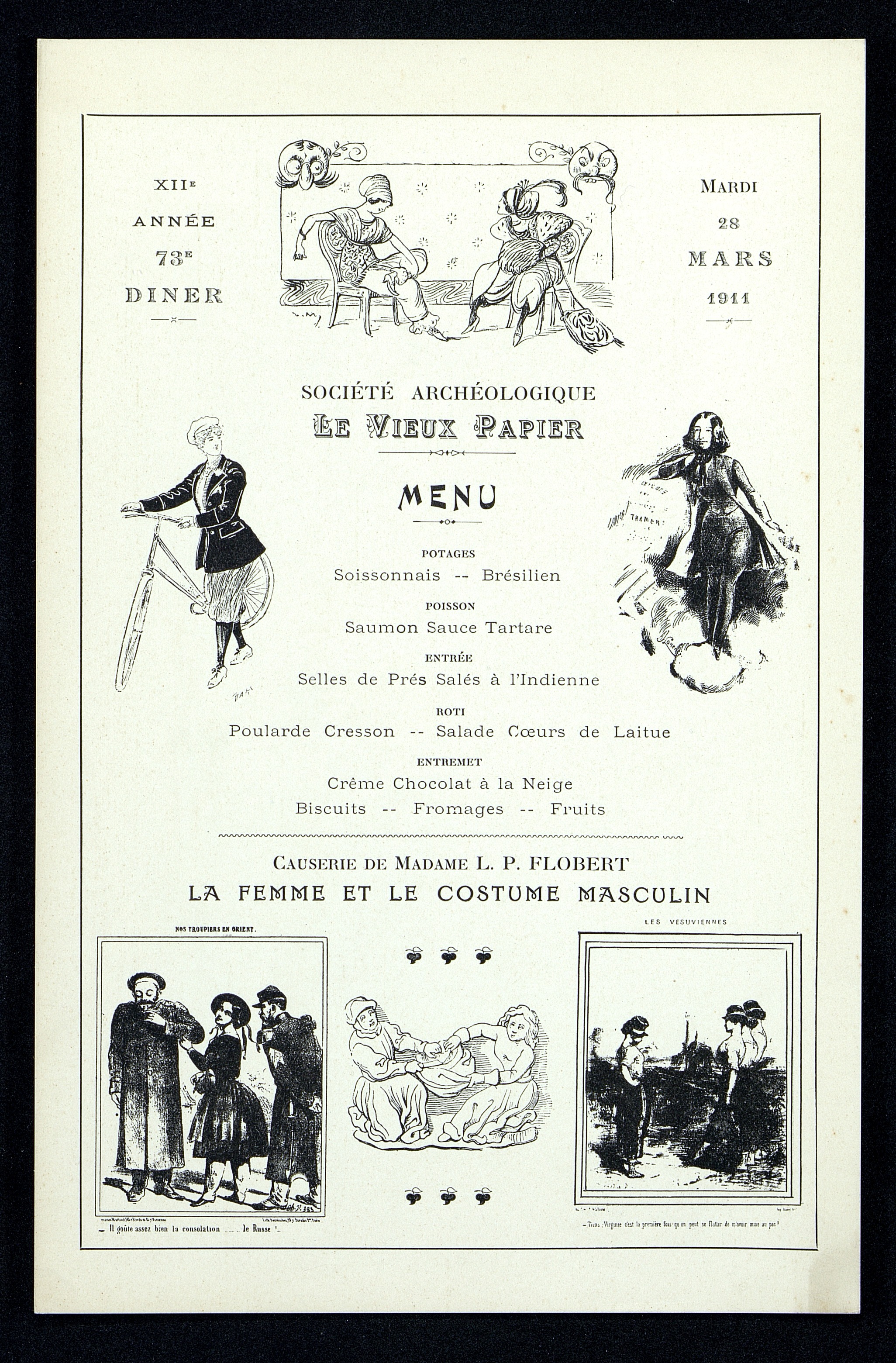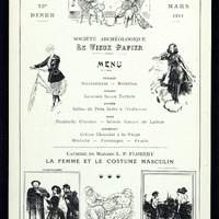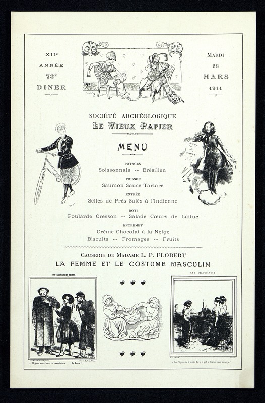 73e Dîner du 28 mars 1911 de la Société Archéologique Historique et Artistique Le Vieux Papier avec une causerie de Mme Flobert, J.P. sur la Femme et le costume masculin.