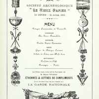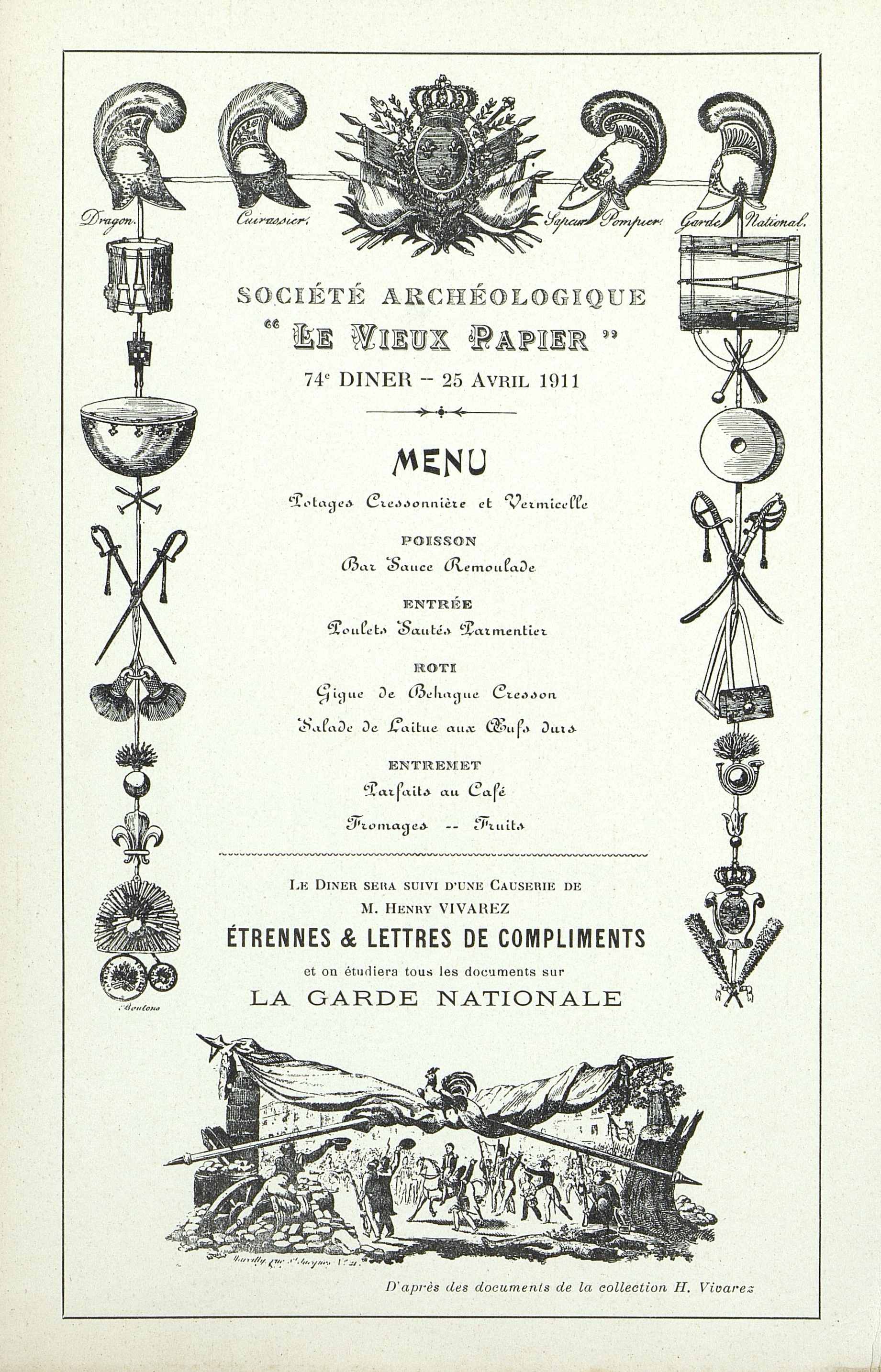 74e Dîner de la Société Archéologique Historique et Artistique Le Vieux Papier du 25 avril 1911, suivie d'une conférence de M. Henry Vivarez sur les Etrennes & lettres de compliments, et sur la Garde Nationale.