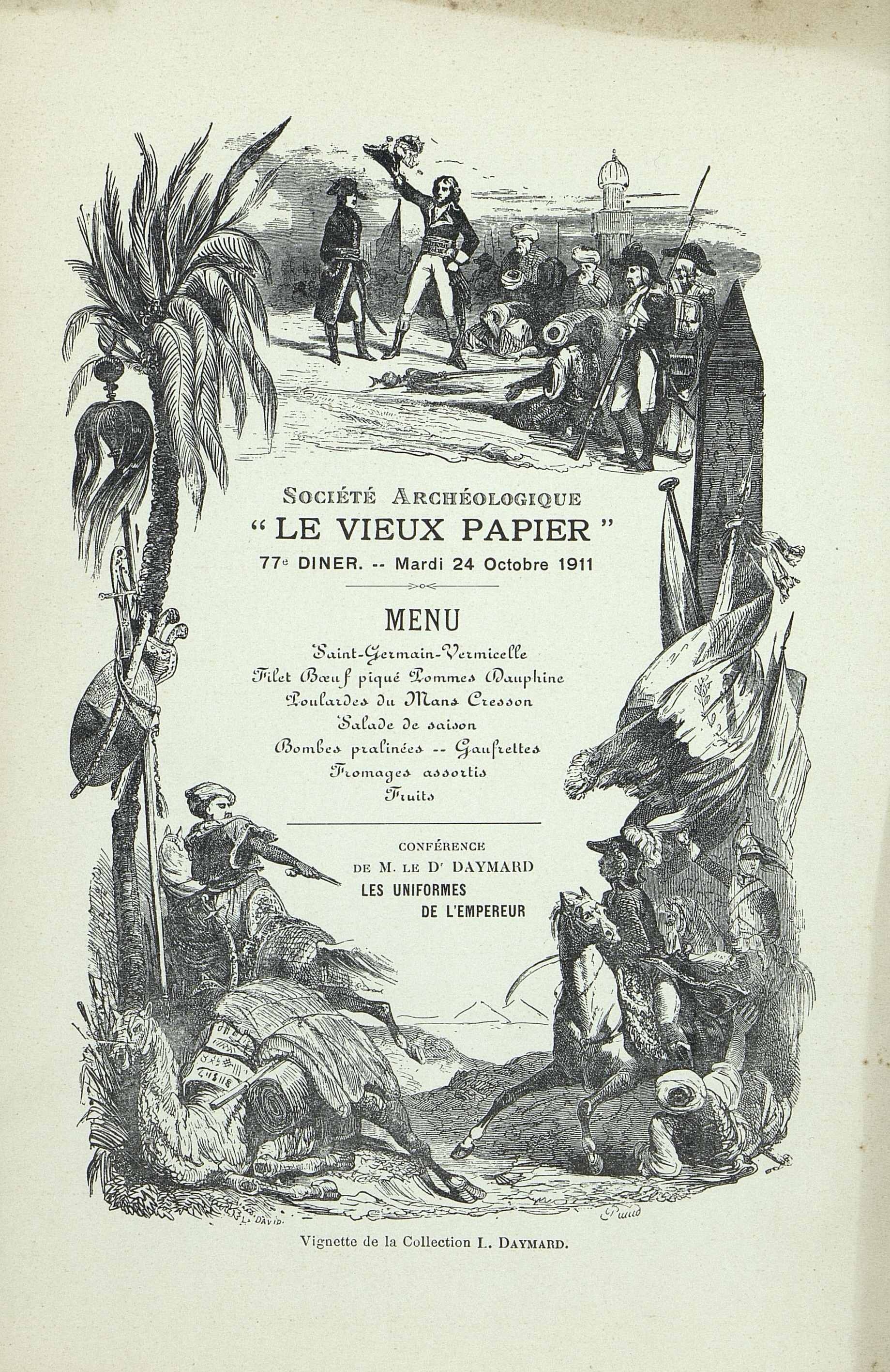 Document illustré du 77e Dîner de la Société Archéologique Historique et Artistique Le Vieux Papier du 24 octobre 1911. Ce diner est suivi de la conférence de M. le Dr Daymard sur : Les uniformes de l'Empereur.