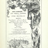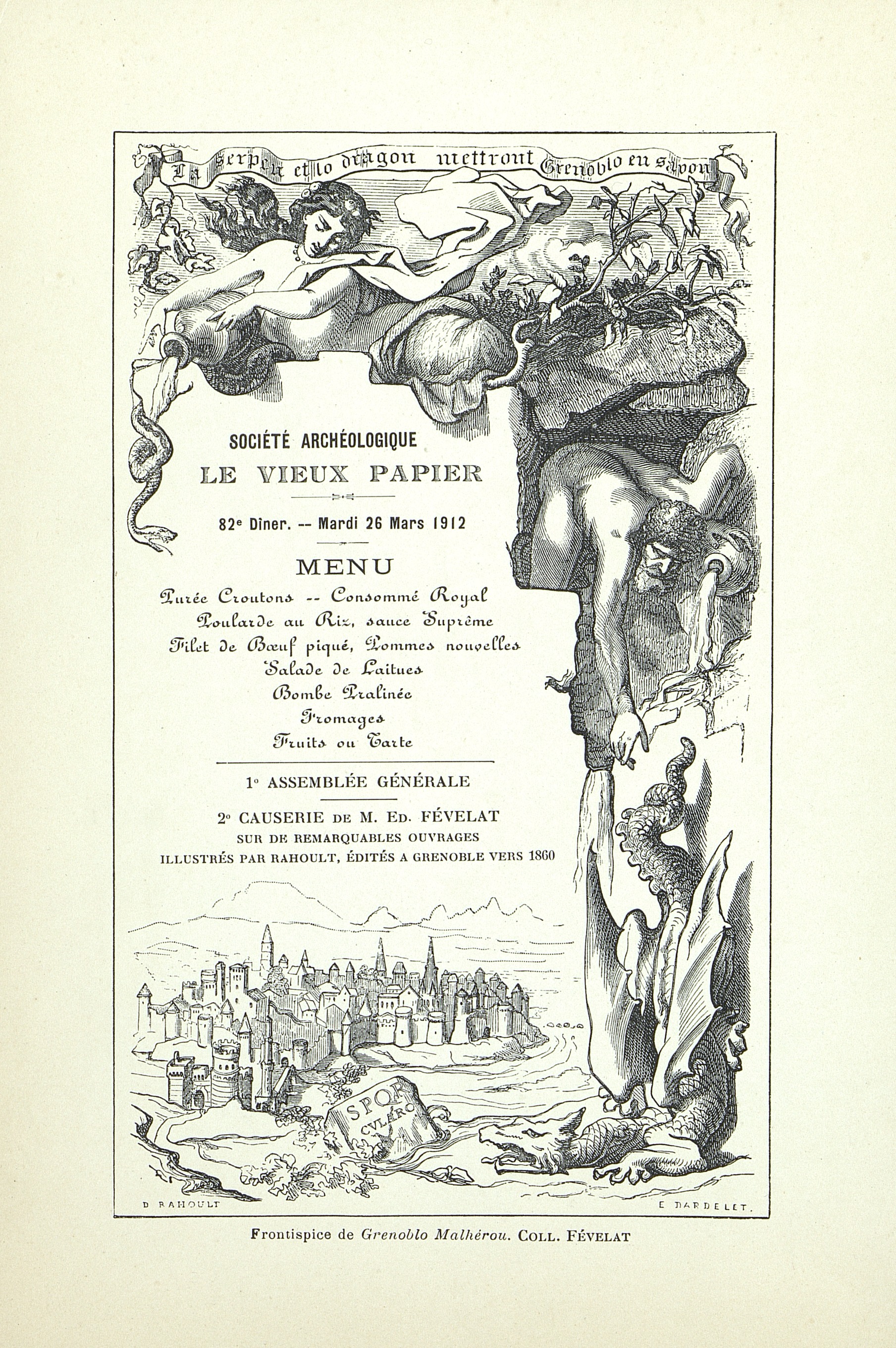 82e dîner du 26 mars 1912 de la Société Archéologique Historique et Artistique Le Vieux Papier, avec son Assemblée générale et une causerie de M. Ed. Févelat sur de remarquables ouvrages illustrés par Rahoult, édités à Grenoble vers 1860.