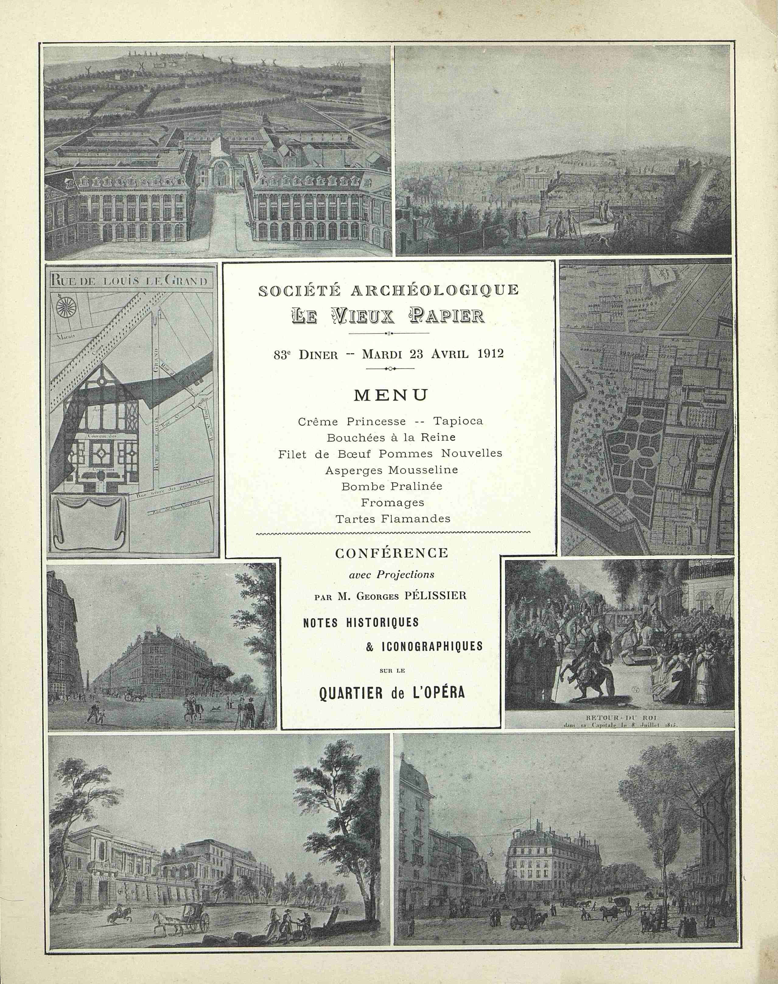 83e dîner du 23 avril 1912 de la Société Archéologique Historique et Artistique Le Vieux Papier, suivie d'une conférence de M. Georges Pélissier : Notes Historiques et Iconographiques sur la Quartier de l'Opéra
