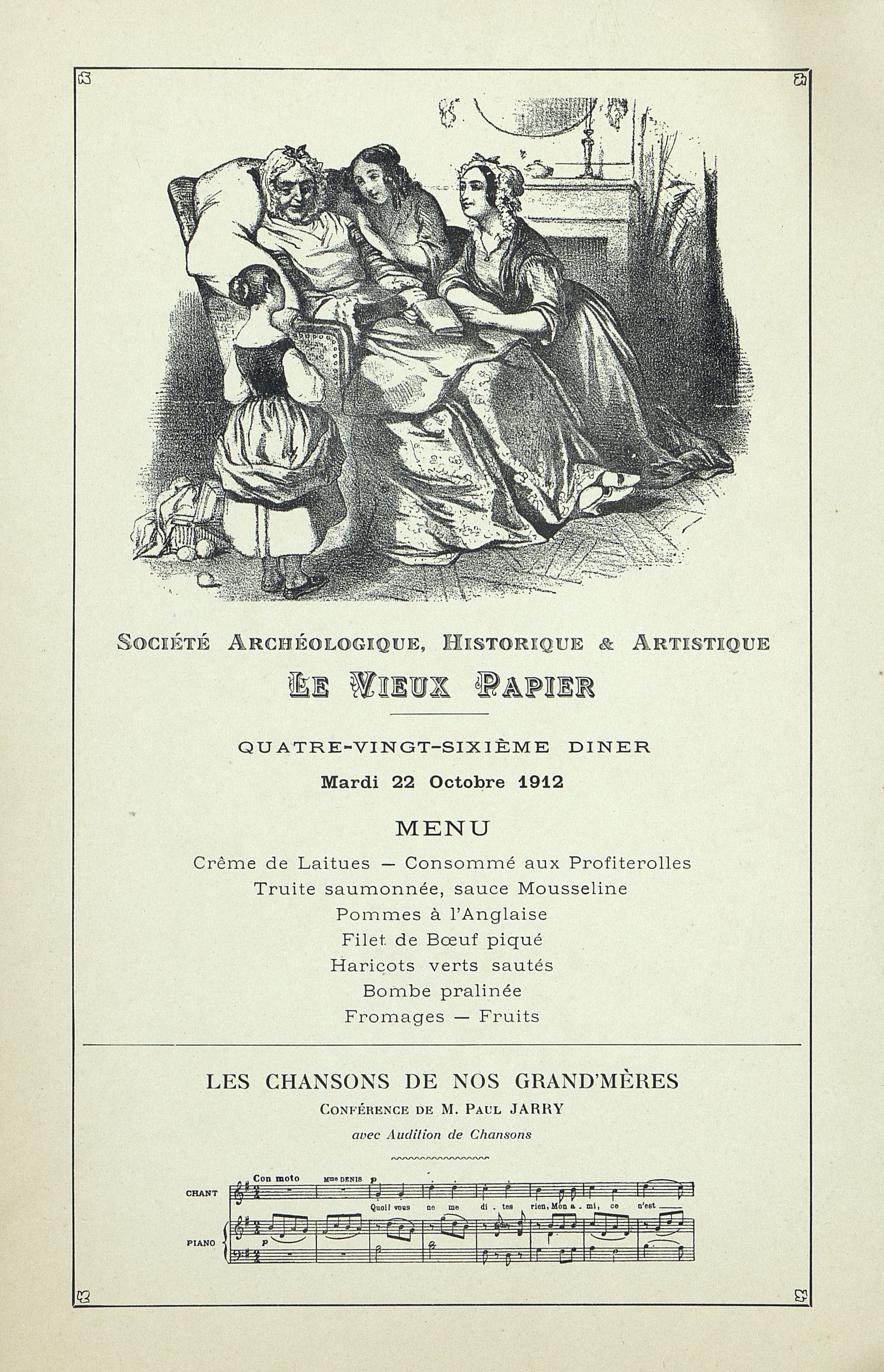 86e dîner du 22 octobre 1912 sur le thème : Les chansons de nos Grand'mères par Paul Jarry.
