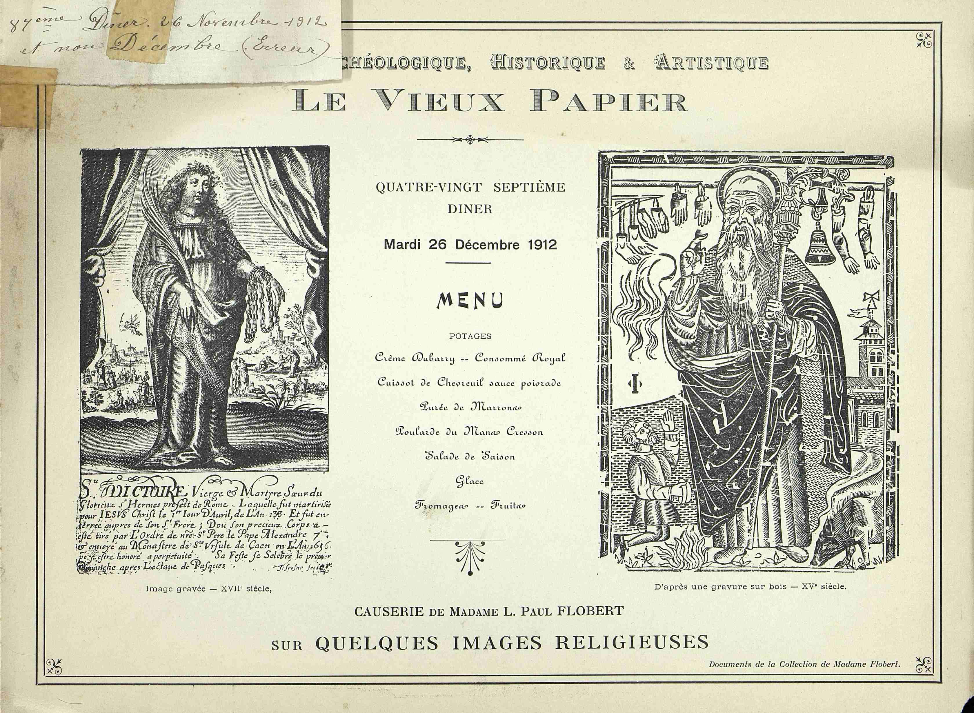 87e dîner du 26 décembre 1912 de la Société Archéologique Historique et Artistique Le Vieux Papier. Une note manuscrite indique une erreur d'imprimerie ; il s'agit du mois de novembre. Causerie, sur les images religieuses. Illustrations : Ste Victoire
