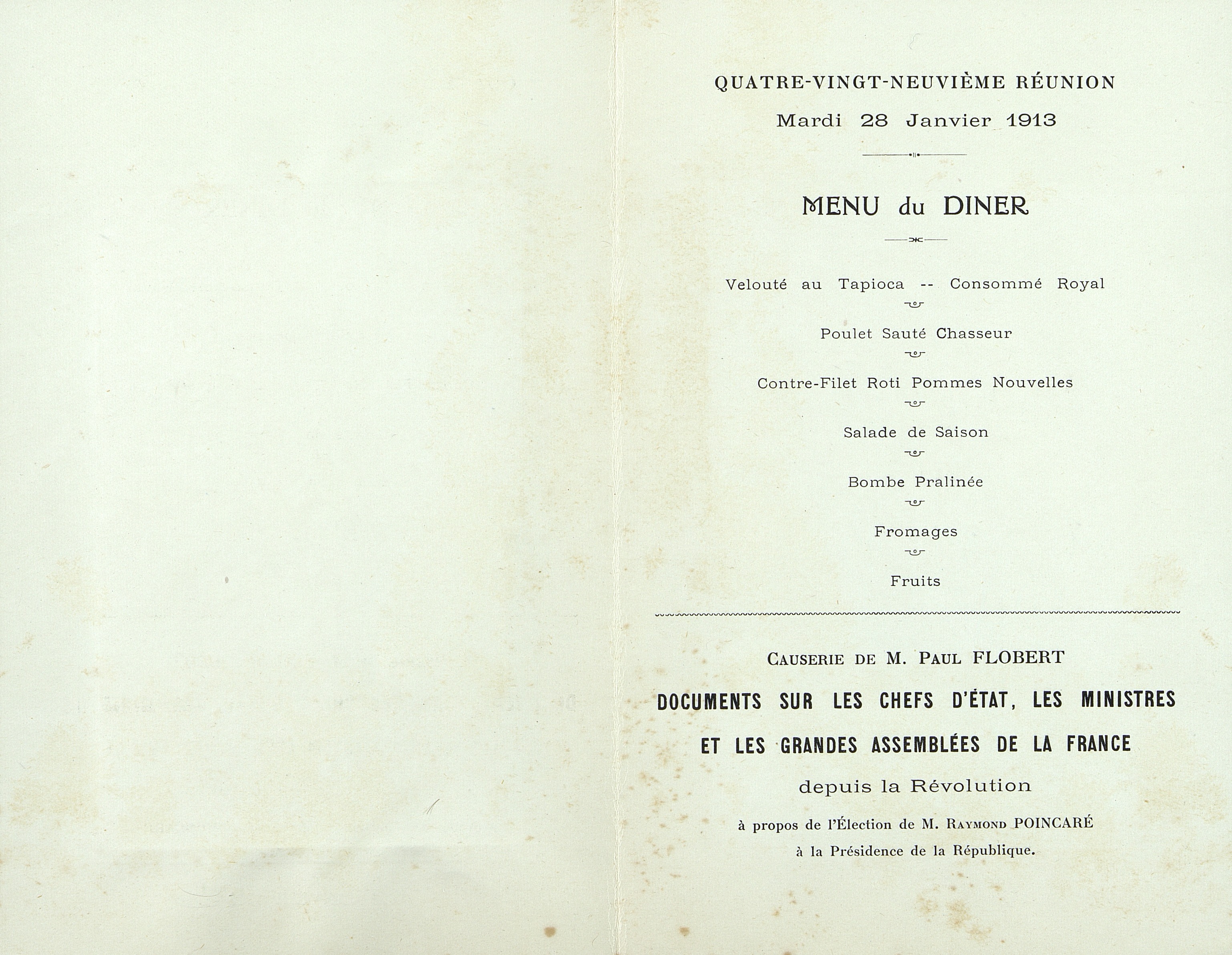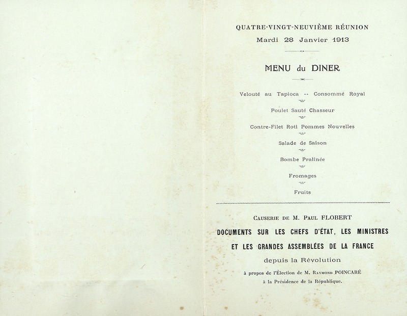 Menu de la 89e réunion du 28 janvier 1913