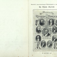 Menu de la 89e réunion du 28 janvier 1913 sur le thème des Présidents de la République, illustré de portraits. Causerie de Paul Flobert sur : Documents sur les chefs d’État, les Ministres et les Grandes Assemblées de la France.