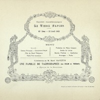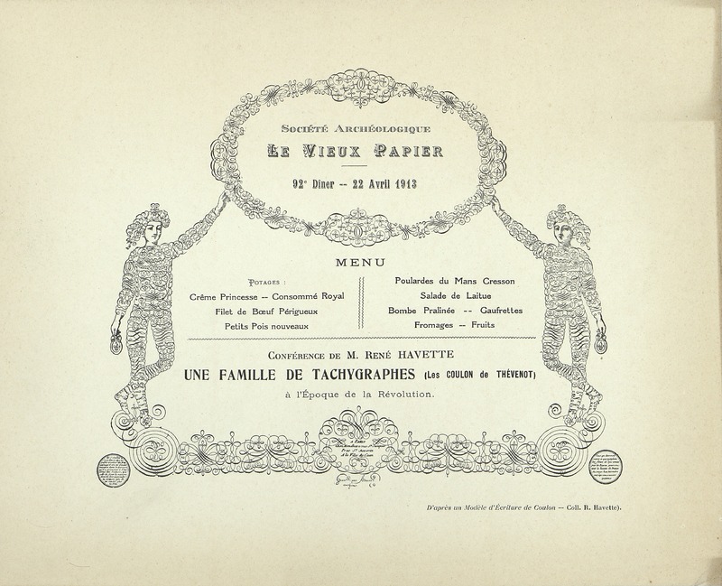 Menu du 92e dîner du Vieux Papiers. Conférence de M. René Havette : Une famille de tachygraphes (Les Coulon de Thévenot à l’Époque de la Révolution).