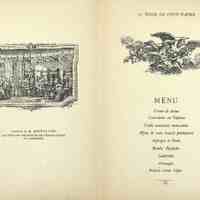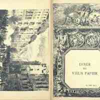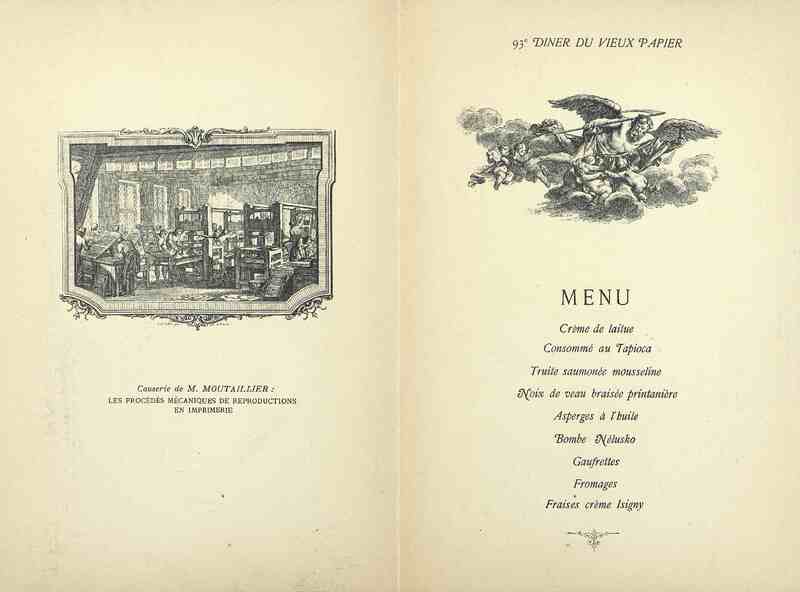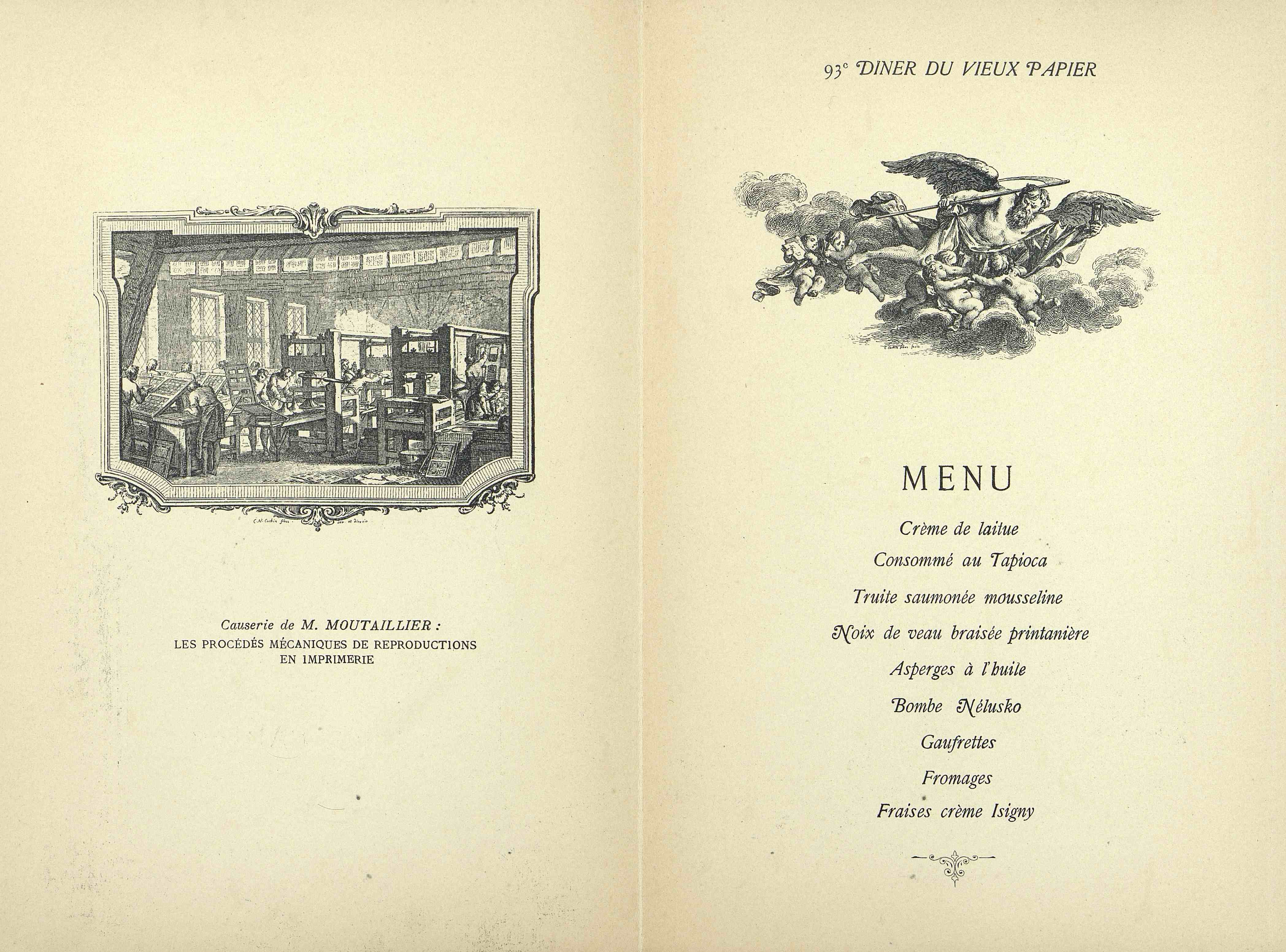 Menu illustré du 93e dîner du Vieux Papier et d'une conférence de M. Moutaillier "Les procédés mécaniques de reproductions en imprimerie". Gravure d'un atelier d'imprimerie par Charles Nicolas Cochin fils. Allégorie du temps par ? Canonnade de la Place Baudoyer par A. Provost Lithograveur, Imprimerie Aubert et Cie Place de la Bourse.