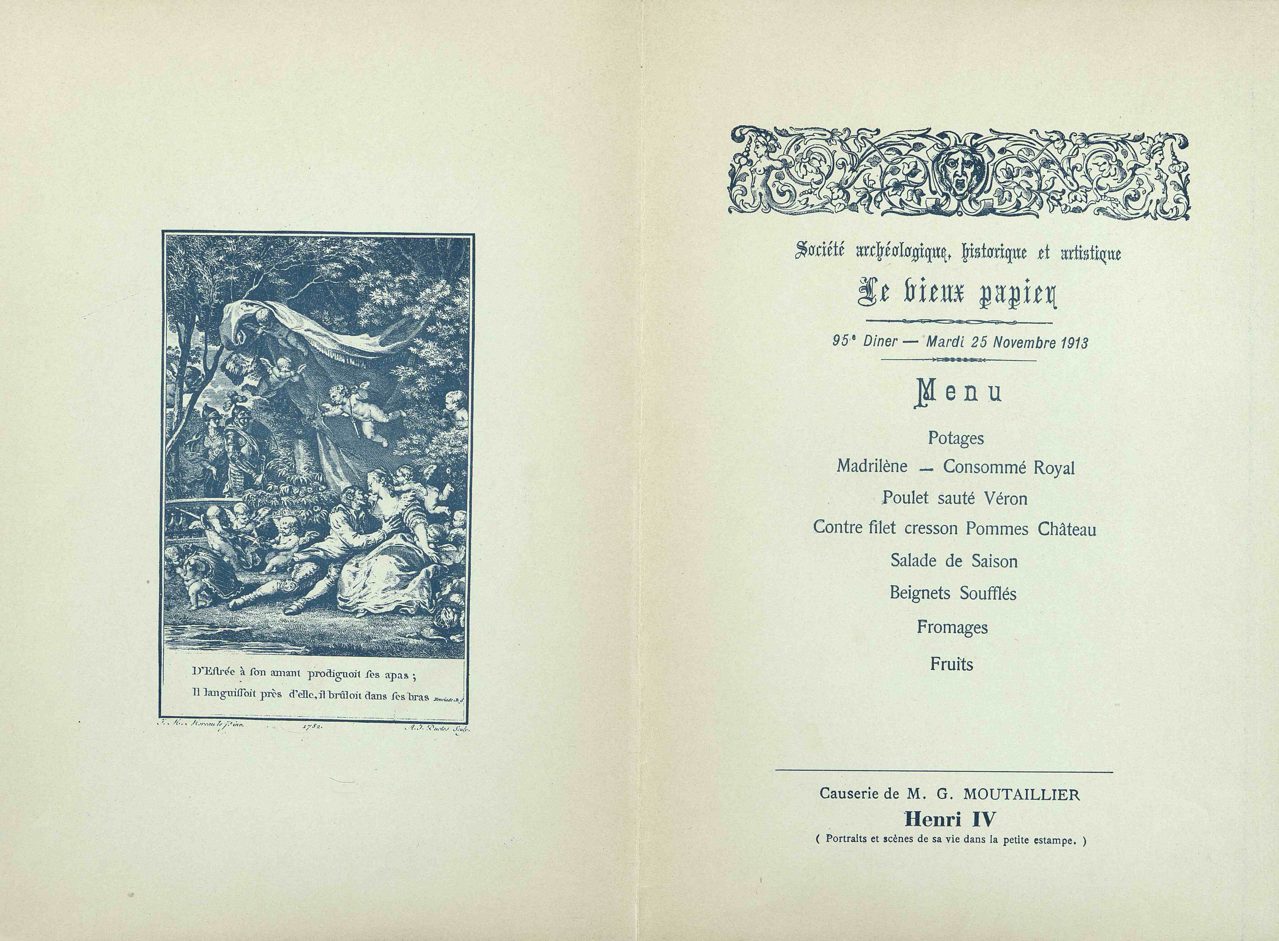95ème dîner du 25 novembre 1913. Thème : Henri IV, causerie G. Moutaillier. Illustration par le portrait en buste d'Henri IV par Lancrenon et gravé par François Foster. Gravure d'Estrée à son amant (1782) Moreau le Jeune et gravure de A.J. Duclos .