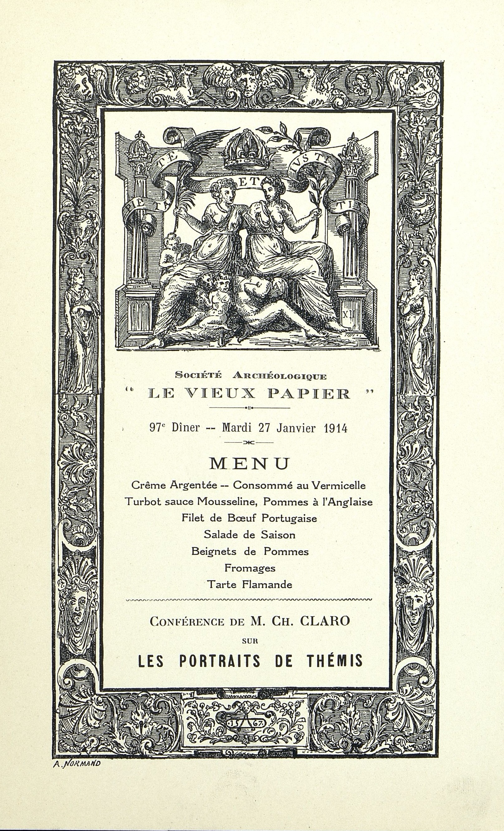 97ème dîner du 27 janvier 1914. Thème, Les Portraits de Thémis, une conférence de M. Ch. Claro.