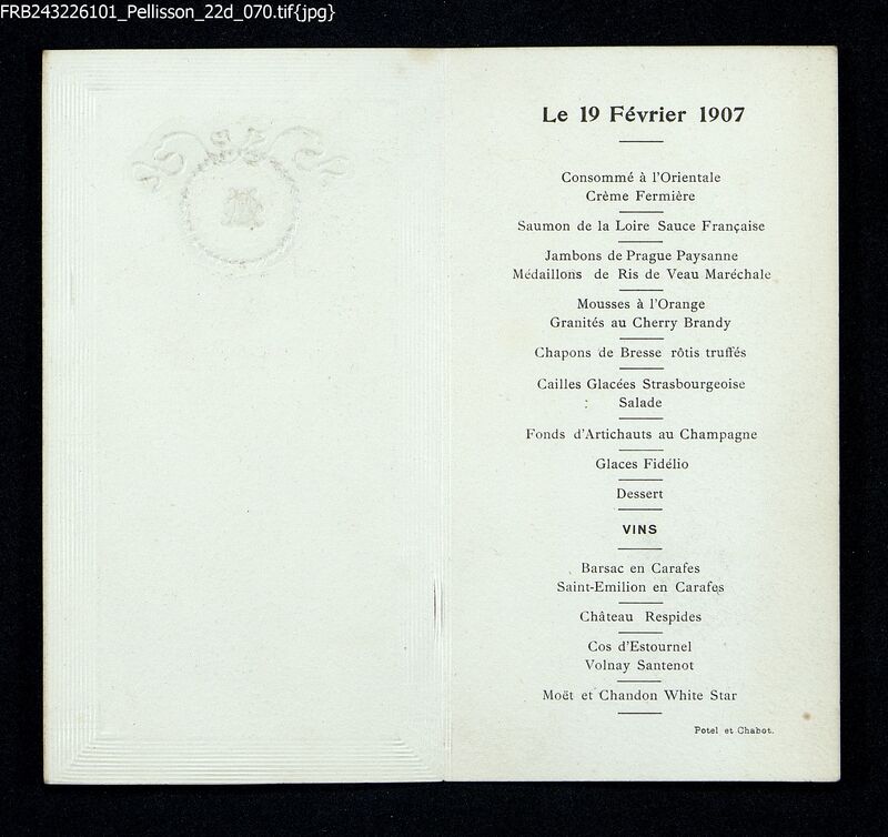 - Pages intérieures du Menu du 19 février 1907 attribué à Mme Gérald