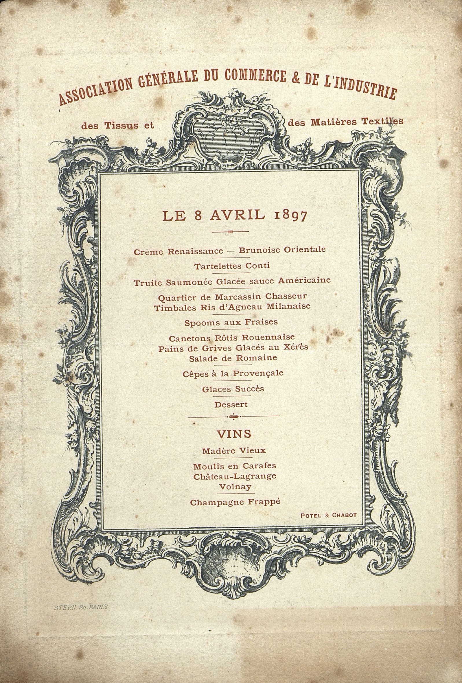 Menu de l'Association Générale du Commerce et de l'Industrie des Tissus et des Matières Textiles.