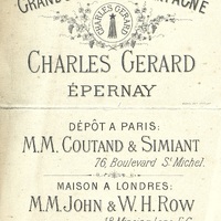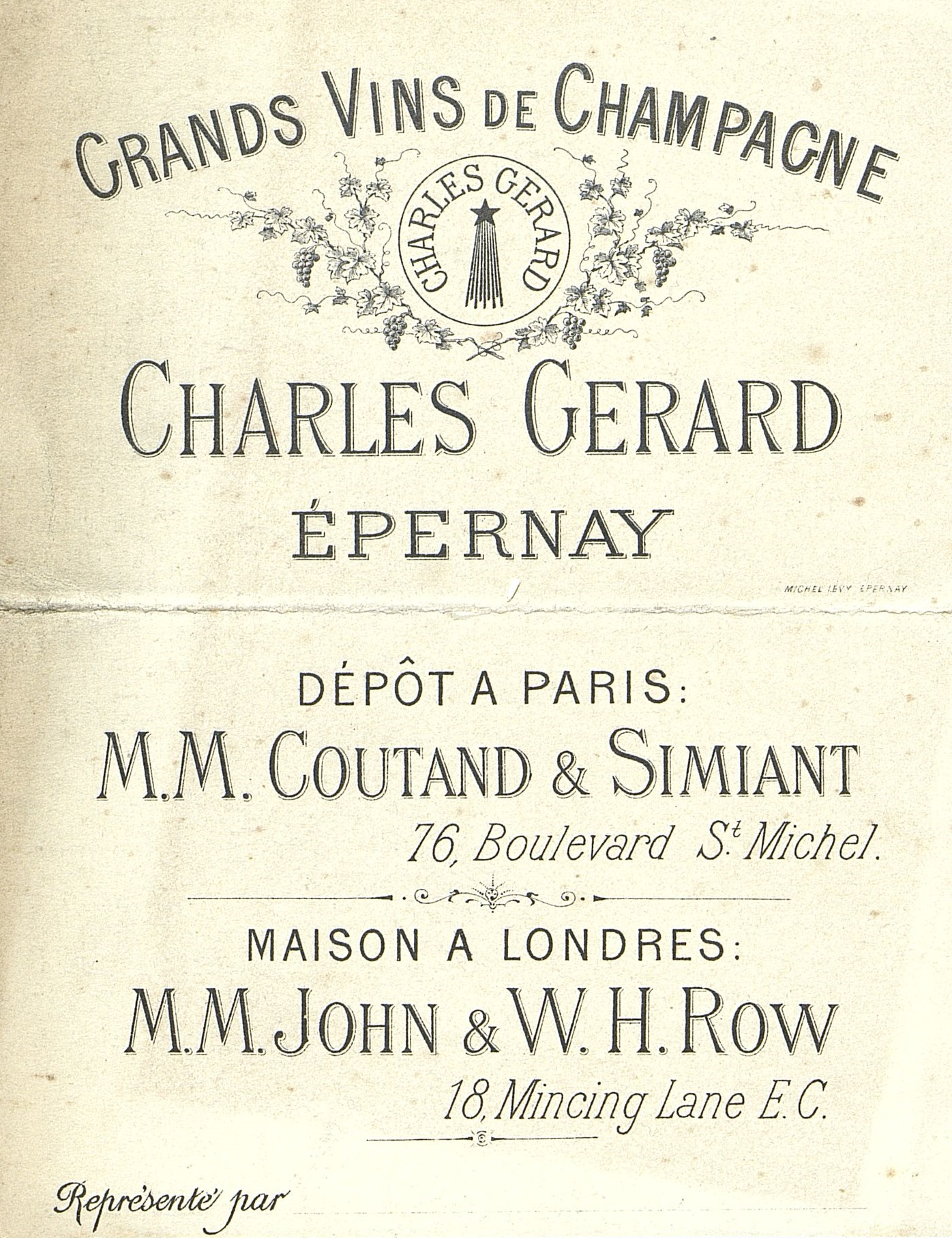 Carte de représentant commercial pour les vins Charles Gérard. Au dos les adresses des déposants de la marque à Paris et Londres.