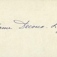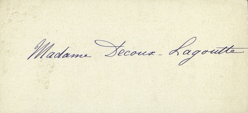 Illustration en angle : décor bleu marine avec entrelacs de feuillages de roses et de rinceaux dorés. Au verso : Madame Decoux-Lagoutte.