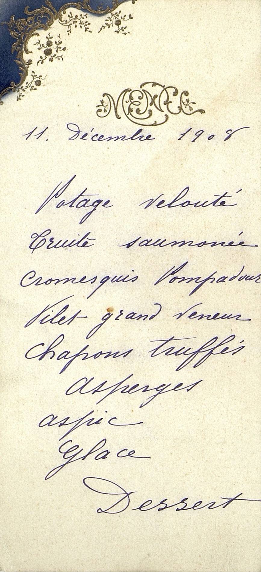 Plats servis : Potage velouté. Truite saumonée. Cromesquis Pompadour. Filet Grand Veneur. Chapons truffés. Asperges. Aspic