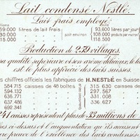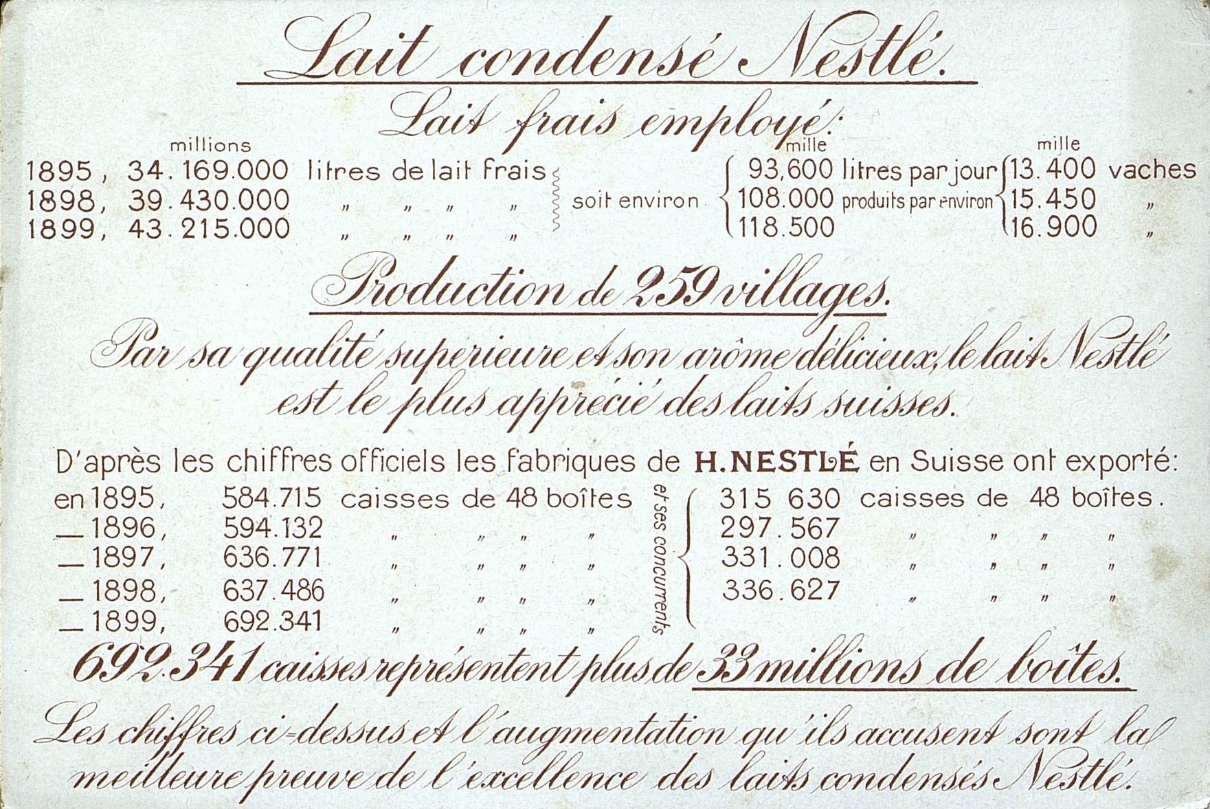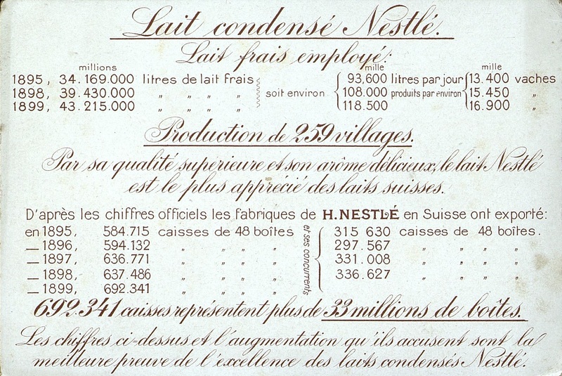 Carte publicitaire illustré pour le lait condensé Nestlé. Au dos des informations publicitaires sur les produits de la marque.
