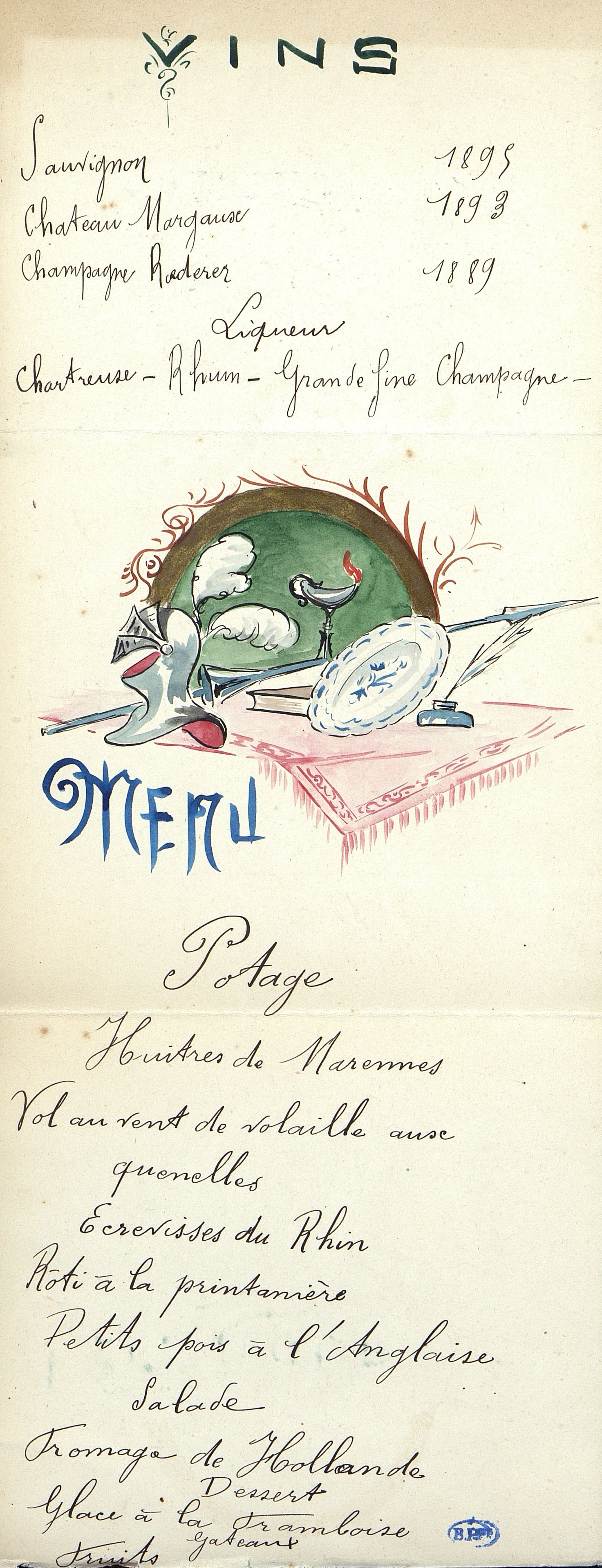 Boissons : Vins : Sauvignon 1895, Château-Margaux 1893, Champagne Roederer 1889.